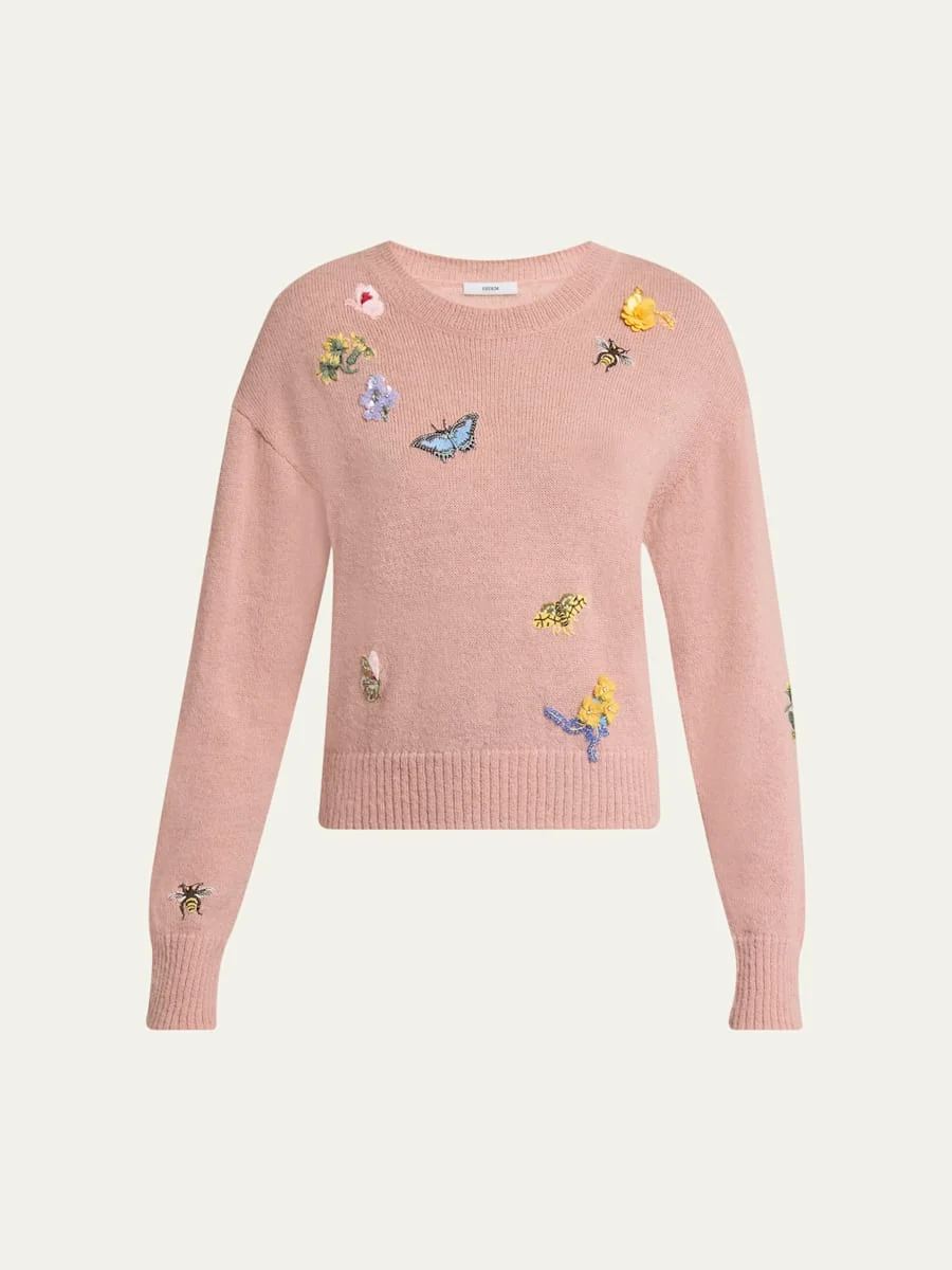 Embellished with colorful embroidery featuring butterflies, bugs, and flowers, this textural sweater from Erdem pays homage to Maria Sibylla Merian. Ribbed finishes on the collar, cuffs, and hem Crew neckline Long sleeves Dropped shoulders Pullover style Polyamide/alpaca/wool Imported
