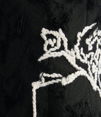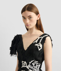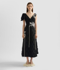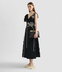 This black dress features a hand-draped V-neck bodice and is made from fil coupe paisley jacquard. It is decorated with vignette threadwork applique inspired by the artist Kaye Donachie. - A-line silhouette - Fully lined - Ankle length - Deep V-neck - Sleeveless - Centre back hook, eye, and concealed zip fastenings - Hidden pockets - Product code: AW25_D188_50611000B Fits true to size. Fabric and Care 95% Viscose, 5% Polyamide. Lining: 100% Silk. Embossing: 45% Wool, 45% Acrylic, 10% Nylon. Dry clean.