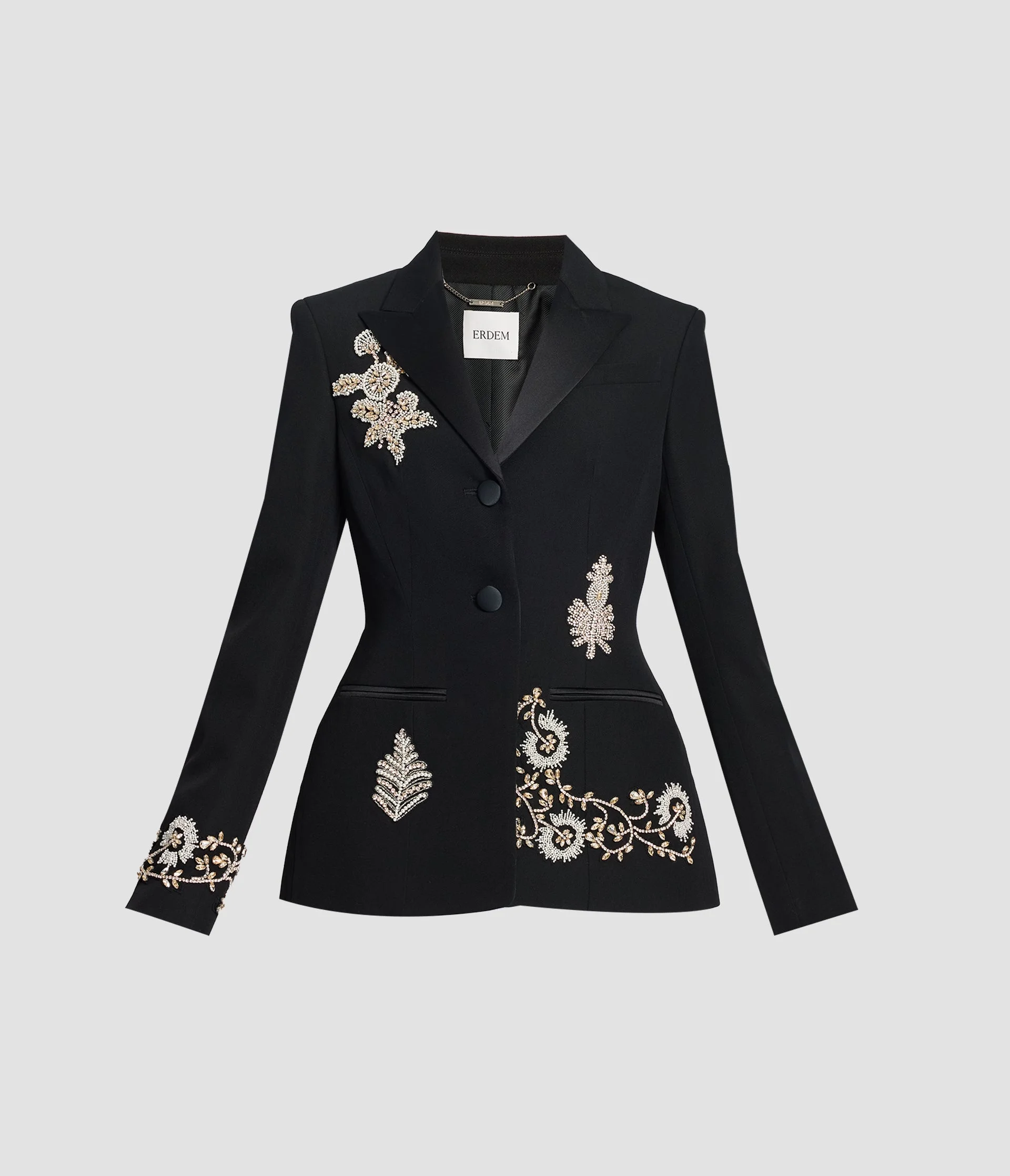Tailored from black grain de poudre, this single-breasted blazer cuts a structured silhouette. It is decorated with pearl, crystal and bead appliques which have been handcrafted in India. The motifs nod to drawings by this season’s muse, Helene Smith. - Structured silhouette - Lapel collar - Centre front button fastenings - Long sleeves - Jet and welt pockets - Fully lined - Product code: SS26_J10_70031000 Fits true to size. Fabric and Care Main: 100% Virgin Wool. Secondary: 100% Linen. Lining: 100% Silk. Dry clean.