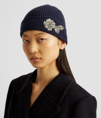 This navy hat is rib-knitted from pure cashmere for a luxuriously cosy finish. It is elevated by a crystal-embellished floral design. Fabric and Care 100% Cashmere. Embroidery: 60% Glass, 30% Brass, 5% Polyester, 5% Nylon. Gentle Dry Clean Only.