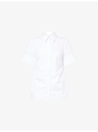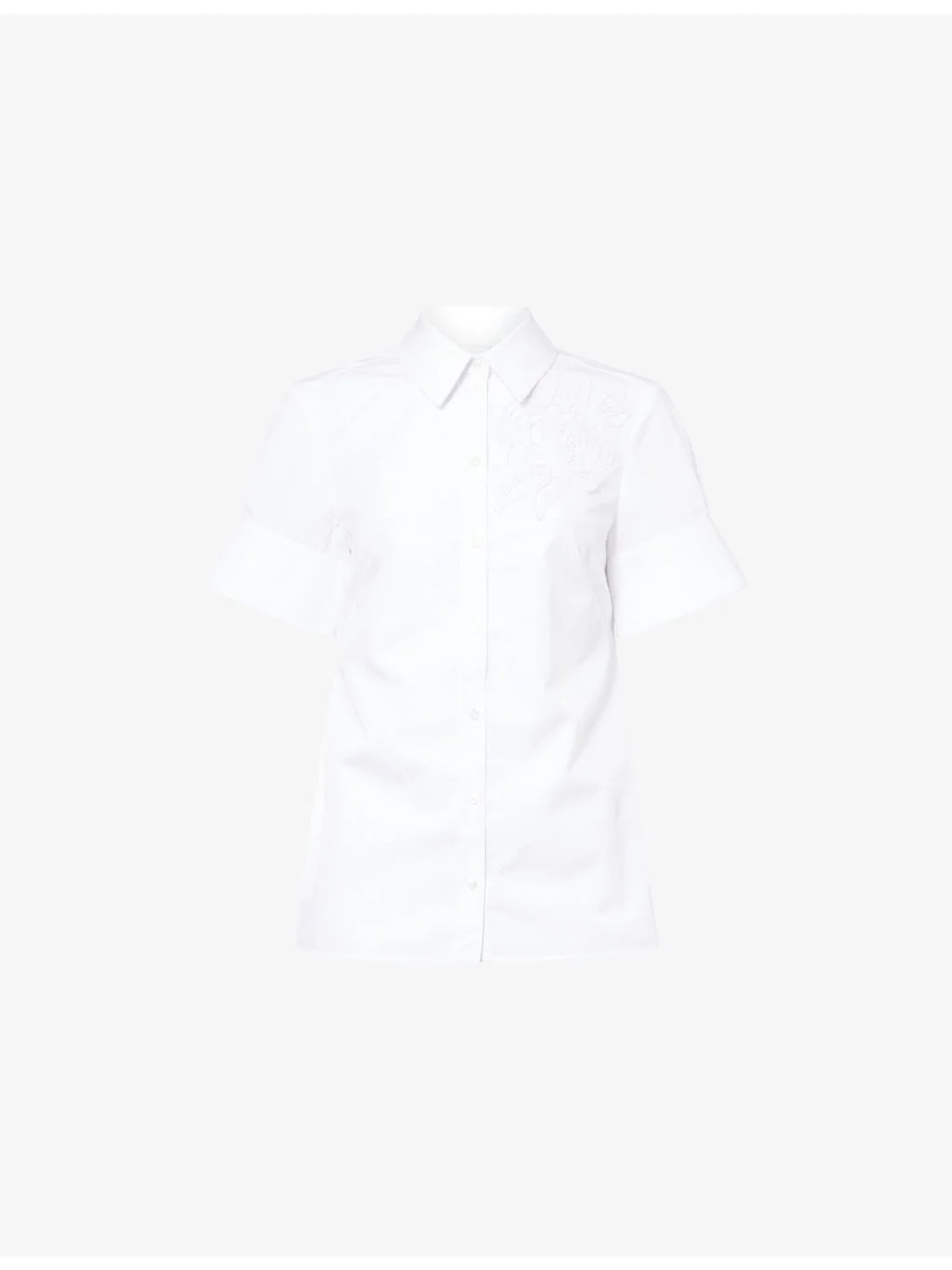PRODUCT DETAILS - Erdem cotton-poplin shirt - 100% cotton; embroidery 70% viscose, 30% polyester - Exposed button fastening at front - Regular fit, collar, short sleeves, buttoned split cuffs, floral embroidery at front, straight yoke at back, darts at front and back - Machine wash at 40°C - True to size - Size UK 8: length 24in / 62cm - Model is 5ft 10in/1.78m and wears a size UK 8 - Lightweight, slight stretch Ref: R04523780