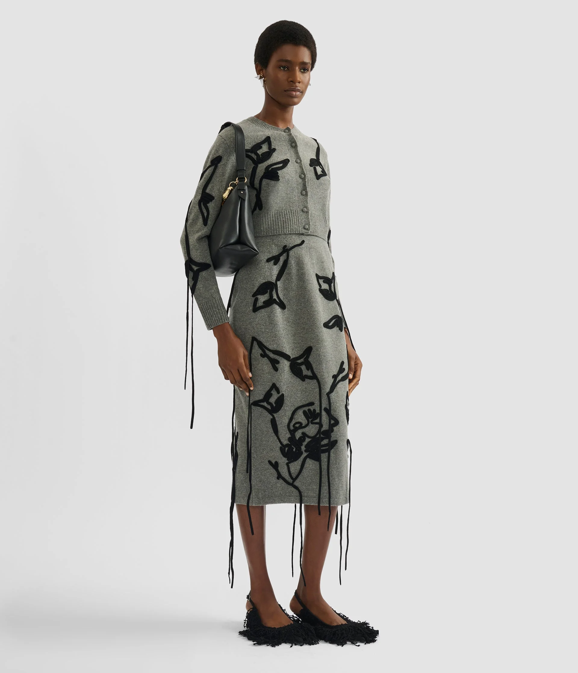 This bubble skirt is knitted from grey melange merino yarn and features hand-sketched knitted applique embroidery inspired by the artist Kaye Donachie. - Bubble silhouette - Unlined - Midi length - Back vent - Centre back hook, eye, and invisible zip fastenings - Embroidered flowers - Product code: AW25_KS5_30151003 Fits true to size. Model is 5'11½ (181cm) and wears a size S. Fabric and Care 100% Extra fine Merino Wool. Dry clean.