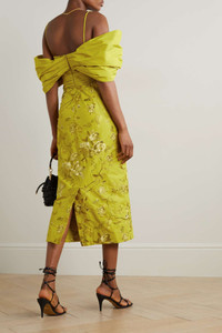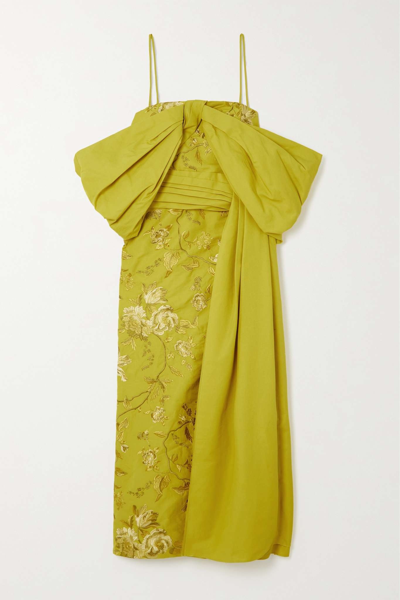 EDITORS'NOTES Erdem's dress has a painterly quality that's equal parts striking and whimsical. One of the opening looks at the Spring '23 show, it's made from cotton-faille that's beautifully embroidered across the crisp surface. The taffeta bow and draped overlay will create plenty of photo ops. SIZE & FIT - Fits true to size, take your normal size - Designed for a close fit with oversized sleeves - Mid-weight, non-stretchy fabric - Model is 177cm/ 5'10" and is wearing a UK 8 DETAILS & CARE - Chartreuse cotton-faille and taffeta - Concealed zip fastening along back - Fabric1: 100% cotton; fabric2: 100% viscose; lining: 100% silk - Dry clean