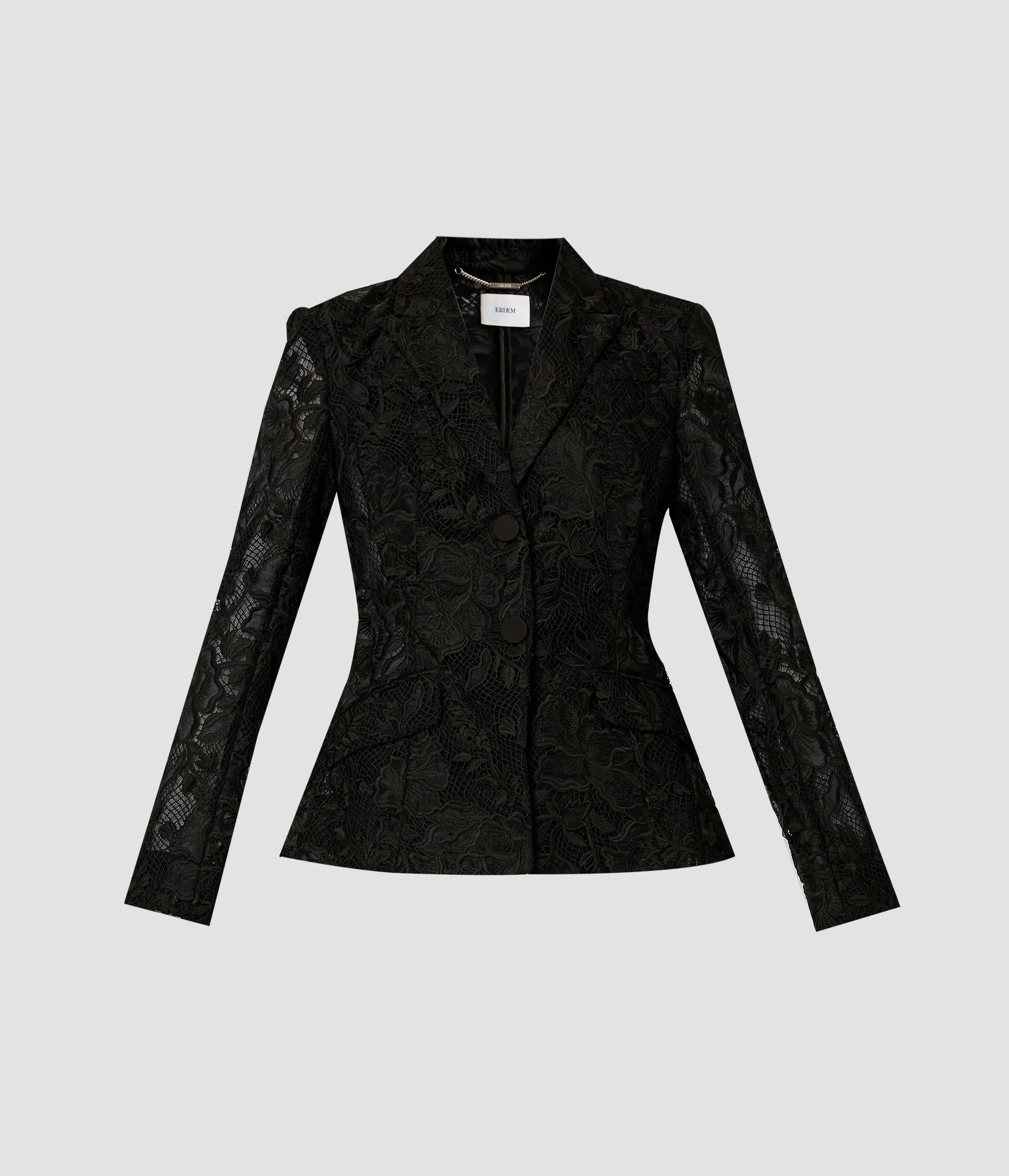 An elegant example of the attention to detail that goes into each of ERDEM’s designs, this sharply tailored blazer is crafted from rose organza guipure. The black fabric is inspired by 19th century handmade guipure and broderie anglaise, combining the best of both and given a modern twist. The fitted jacket is unlined at the sleeves to showcase the intricacies of the floral pattern. Size and Fit This jacket has a lapel collar, a welt pocket at the chest, jet pockets at the hips, and long sleeves with button-fastening cuffs. It has a fitted waist and a peplum hem. It has two centre front button fastenings and is fully lined in ERDEM-branded lining. Fits true to size. Fabric and Care 100% Polyester. Fabric2: 100% Polyamide. Fabric3: 100% Polyamide. Lining: 100% Silk. Dry Clean.