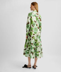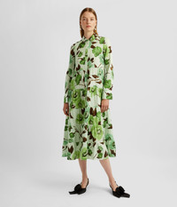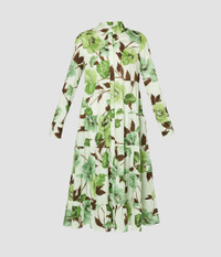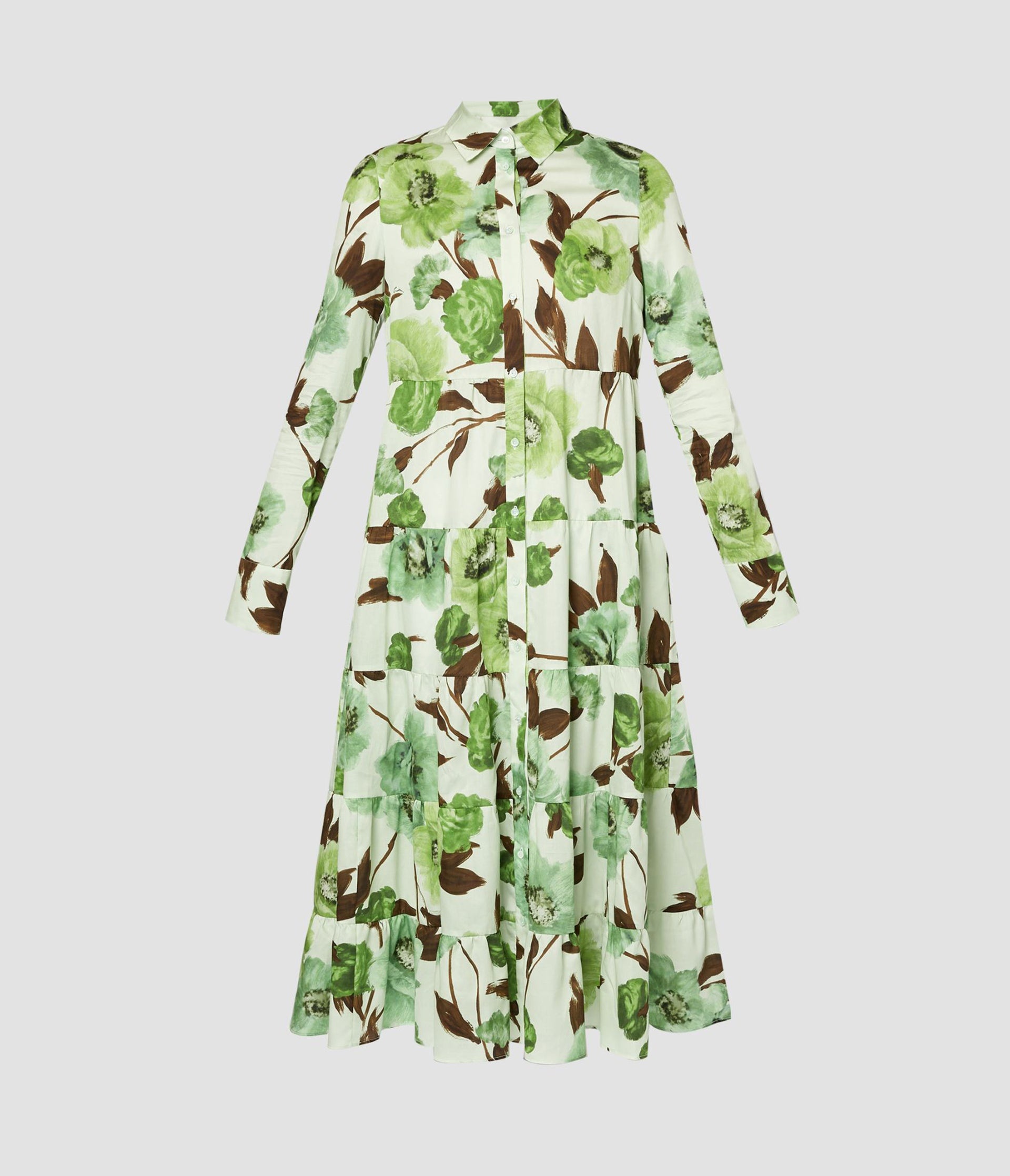 Perfect for everyday wear, this shirt dress is cut from lightweight cotton poplin. Its relaxed silhouette is framed by a point collar, long sleeves, and a tiered skirt. In an eye-catching shade of pistachio, it is decorated with the Violetta Bloom print, a design evocative of 1950s and ‘60s hand painted couture florals. Size and Fit This mid-length dress has long sleeves, a shirt collar, and a tiered skirt. It has button fastenings through the centre front. Fits true to size. Model is 5'10" and wears a size UK 6. Fabric and Care 100% Cotton. Do Not Machine Wash / Delicate Dry Clean / Do Not Bleach / Do Not Tumble Dry / Cool Iron On Reverse.