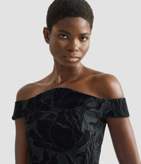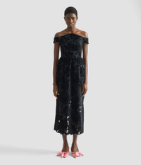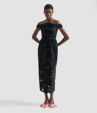 This tactile black cocktail dress is made from lustrous velvet floral cutwork mounted onto tulle. The curved neckline echoes the shape of the tulip-inspired skirt. - Tulip silhouette - Fully lined - Midi length - Off the shoulder neckline - Off the shoulder short sleeves - Scallop-edge lace hem - Centre back hook, eye, and concealed zip fastenings - Product code: PS26_D176_50771000 Slim fit at bust. If in between sizes, recommend sizing up. Fabric and Care 94% Polyester, 6% Elastane. Fabric 2: 71% Acetate, 29% Viscose. Lining: 100% Silk. Dry clean.