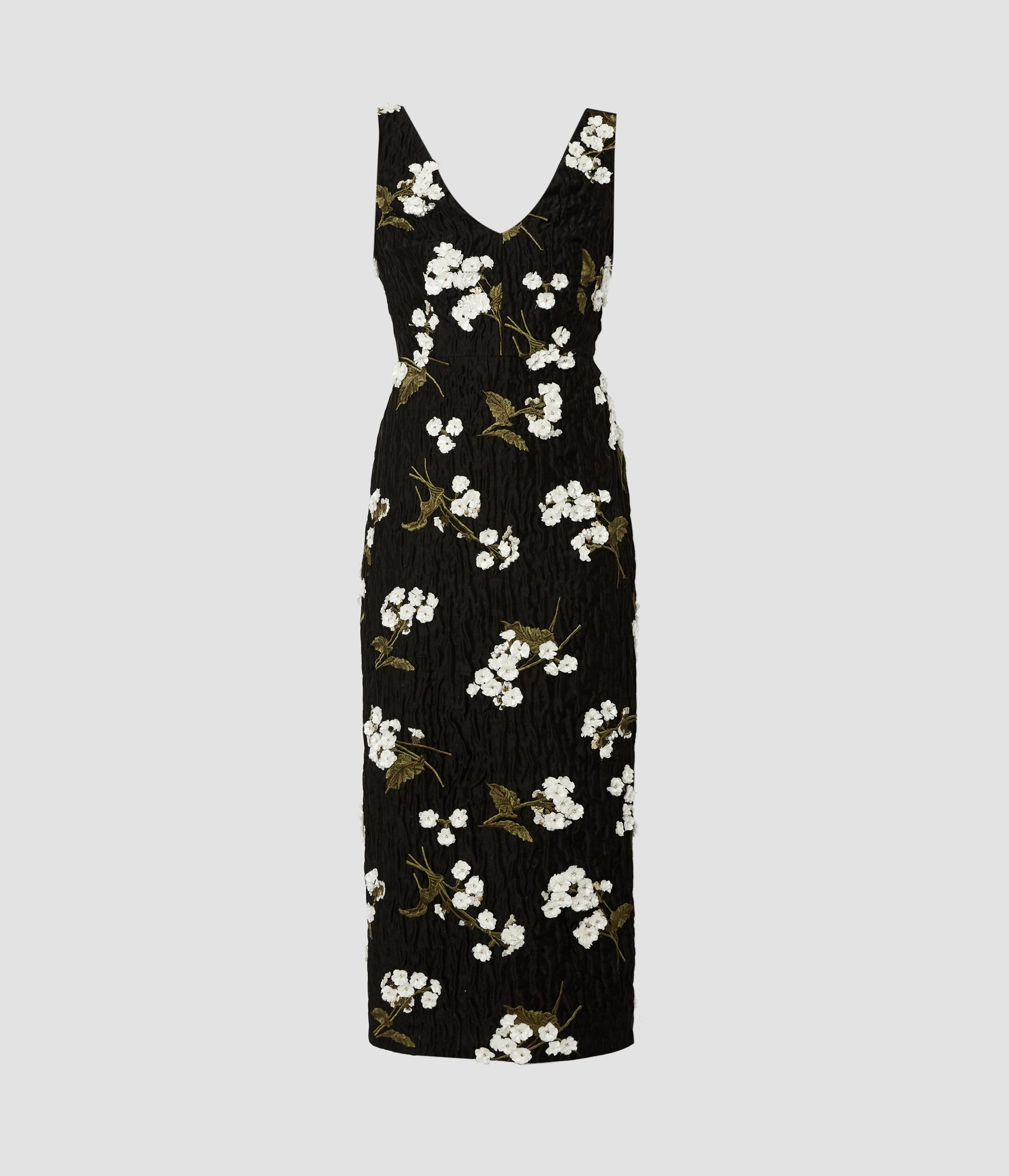 Crafted from textured cloque jacquard, this black dress is embroidered with olive green threadwork and three-dimensional white flowers that are applied by hand. Each flower has a glass crystal at its centre. Shaped for a slim silhouette, this sleeveless style has a rounded V-neckline and mid-length hem. Size and Fit This sleeveless, mid-length dress has a V-neckline and a centre back vent. It has hook, eye, and invisible zip fastenings at the centre back, and is fully lined in black silk crepe de chine. Fits true to size. Fabric and Care 66% Virgin Wool, 34% Nylon. Embroidery: 50% Polyester, 25% Glass, 25% Brass. Lining: 100% Silk. Dry Clean.