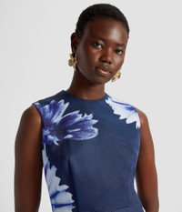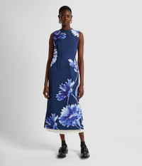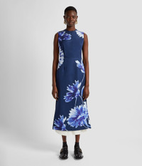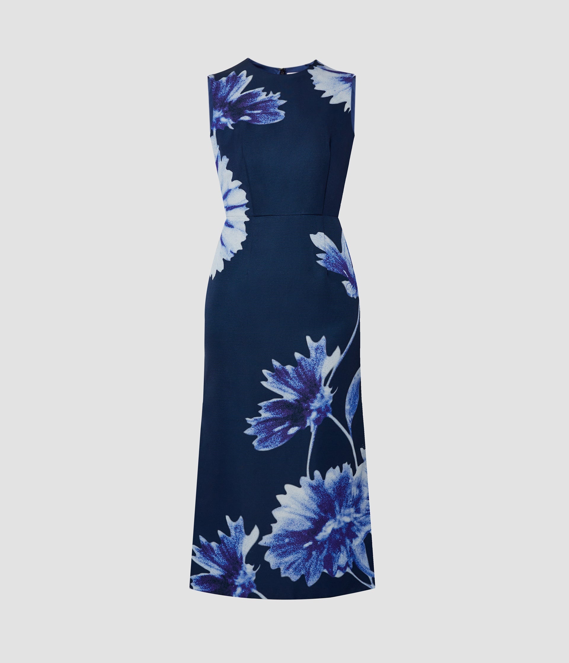 With its streamlined silhouette, this fitted pencil dress is the perfect showcase for the season’s Troubridge Floral – a print made up of large-scale daisies on an indigo base. It is cut from cotton faille and features a crew neckline and mid-length hem. Size and Fit This sleeveless, mid-length dress has a crew neckline, fitted waist, and pencil skirt with vents at the side seams. It has hook, eye, and invisible zip fastenings at the centre back, and is fully lined in navy silk crepe de chine. Fits true to size. Fabric and Care 66% Cotton, 34% Viscose. Lining: 100% Silk. Dry Clean.