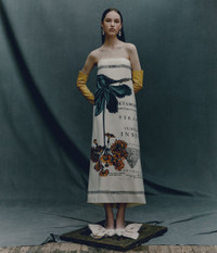 Cut from midweight duchess, this structured dress has an internal corset and a straight fit. The fabric is printed with an oversized floral etching inspired by traditional scientific drawings of flora and fauna. - Straight silhouette - Fully lined - Ankle length - Strapless - Centre back hook, eye, and concealed zip fastenings - Product code: PS26_D102_51438008 Slim fit at bodice. If in between sizes, recommend sizing up. Fabric and Care 100% Viscose (Fsc) Lining: 100% Silk. Dry clean.
