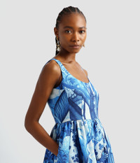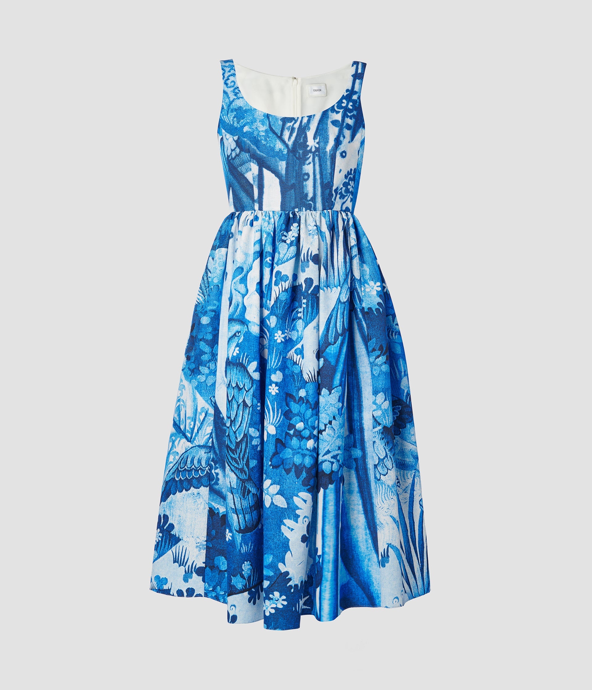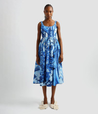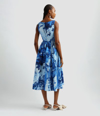 Shaped for a flattering fit-and-flare silhouette, this sleeveless dress has a scoop neck, gathered waist and full skirt which falls to a mid-length hem. It is cut from cotton faille which is printed in an antique-inspired tapestry print encompassing birds and botanicals. Shades of blue keep the look contemporary. Size and Fit Model is 5'10" and wears a size UK 6. Fabric and Care 66% Cotton, 34% Viscose. Lining: 100% Silk. Do Not Machine Wash / Delicate Dry Clean / Do Not Bleach / Do Not Tumble Dry / Cool Iron on Reverse.