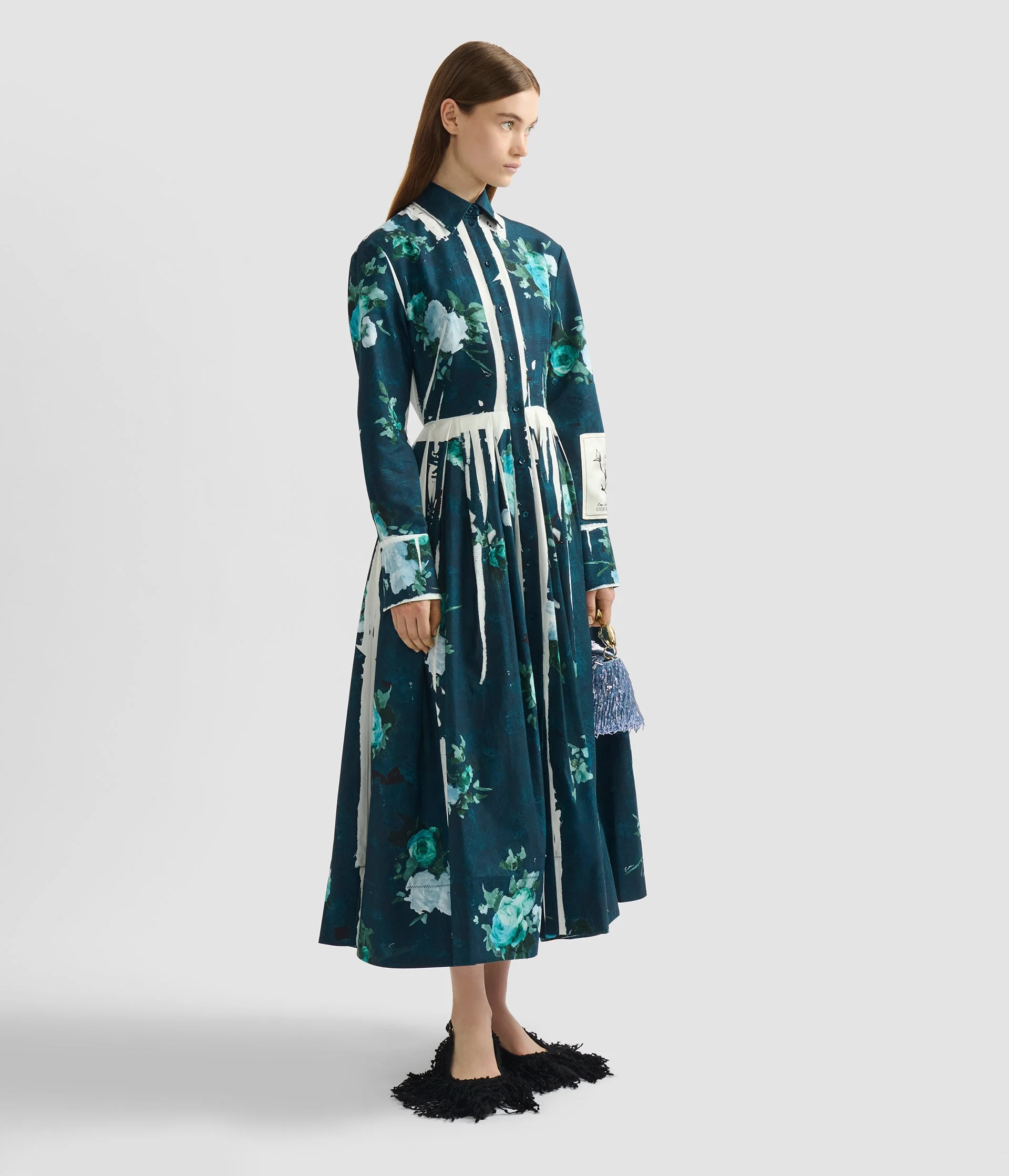 This shirt dress is crafted from cotton faille with an engineered navy and blue rose bouquet overprint. It has an embroidered patch at the cuff. - Fit and flare silhouette - Fully lined - Ankle length - Shirt collar - Long sleeves with button-fastening cuffs - Centre front button fastenings - Product code: AW25_D153_50454001 Fits true to size. Fabric and Care 100% Cotton. Trim: 100% Polyester. Dry clean.