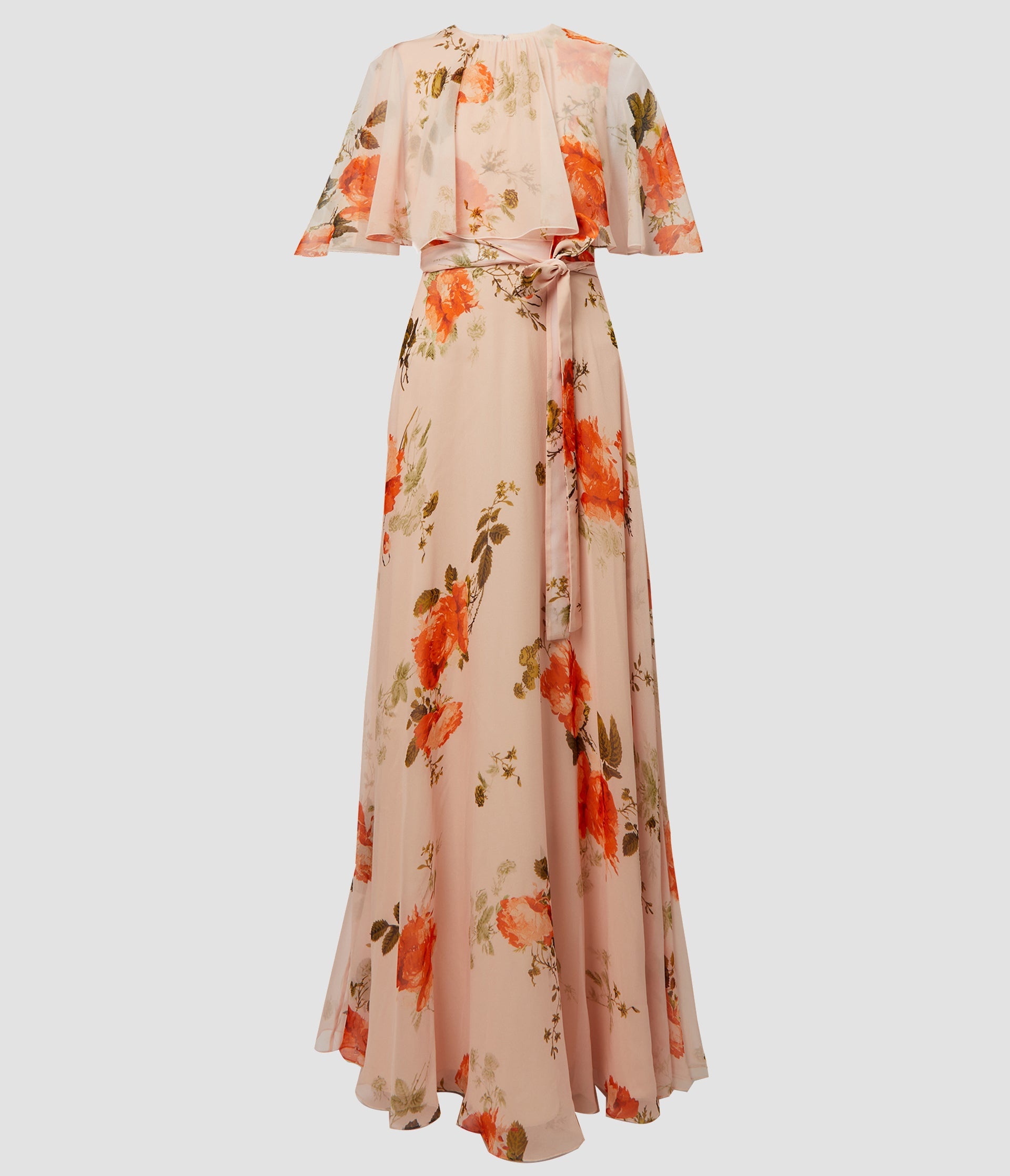 Exuding feminine elegance, this gown is crafted with a fitted bodice and a cape-style overlay while a bias-cut skirt falls to a floor-length hem. It is crafted from shell-pink silk voile, which has a lightweight quality to it. The fabric is decorated with the Rose print in bold vermillion. Size and Fit Model is 5'10" and wears a size UK 6. Fabric and Care 100% Silk. Lining: 73% Acetate, 27% Silk. Do Not Machine Wash / Delicate Dry Clean / Do Not Bleach / Do Not Tumble Dry / Cool Iron on Reverse.