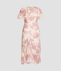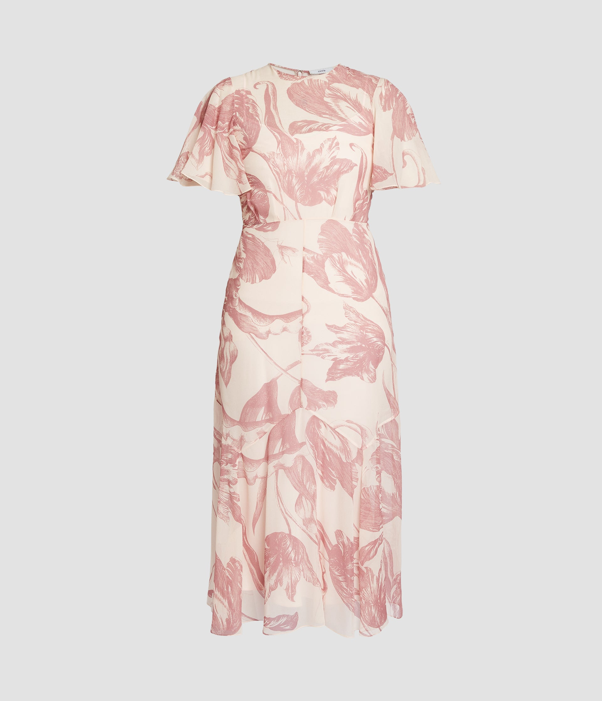 Cut from lightweight silk voile, this cameo pink dress is decorated with a botanical engraving-inspired print. It has flutter sleeves and falls to a floaty hem. - Slim silhouette - Detachable slip - Midi length - Crew neck - Short fluted sleeves - Centre back hook, eye, and concealed zip fastenings - Product code: PS26_D38_51315013 Fits true to size. Fabric and Care 100% Silk. Lining:100% Silk. Dry clean.