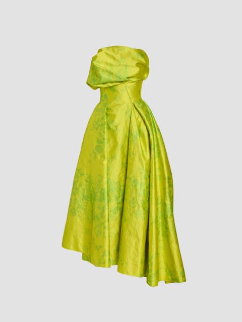 Draped from textured satin, this strapless gown is crafted with an internal corset and falls to a full, asymmetric skirt. The trailing floral design is inspired by dresses worn by Marie Antoinette. - Fit and flare silhouette - Fully lined - Midi length - Straight neck - Strapless - Asymmetric hem - Concealed zip fastening - Product code: SS26_D220_51618015 Fits true to size. Fabric and Care Main: 94% Polyester, 6% Metal. Secondary: 100% Polyamide. Lining: 100% Silk. Trim: 100% Cotton. Dry clean.