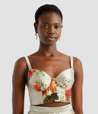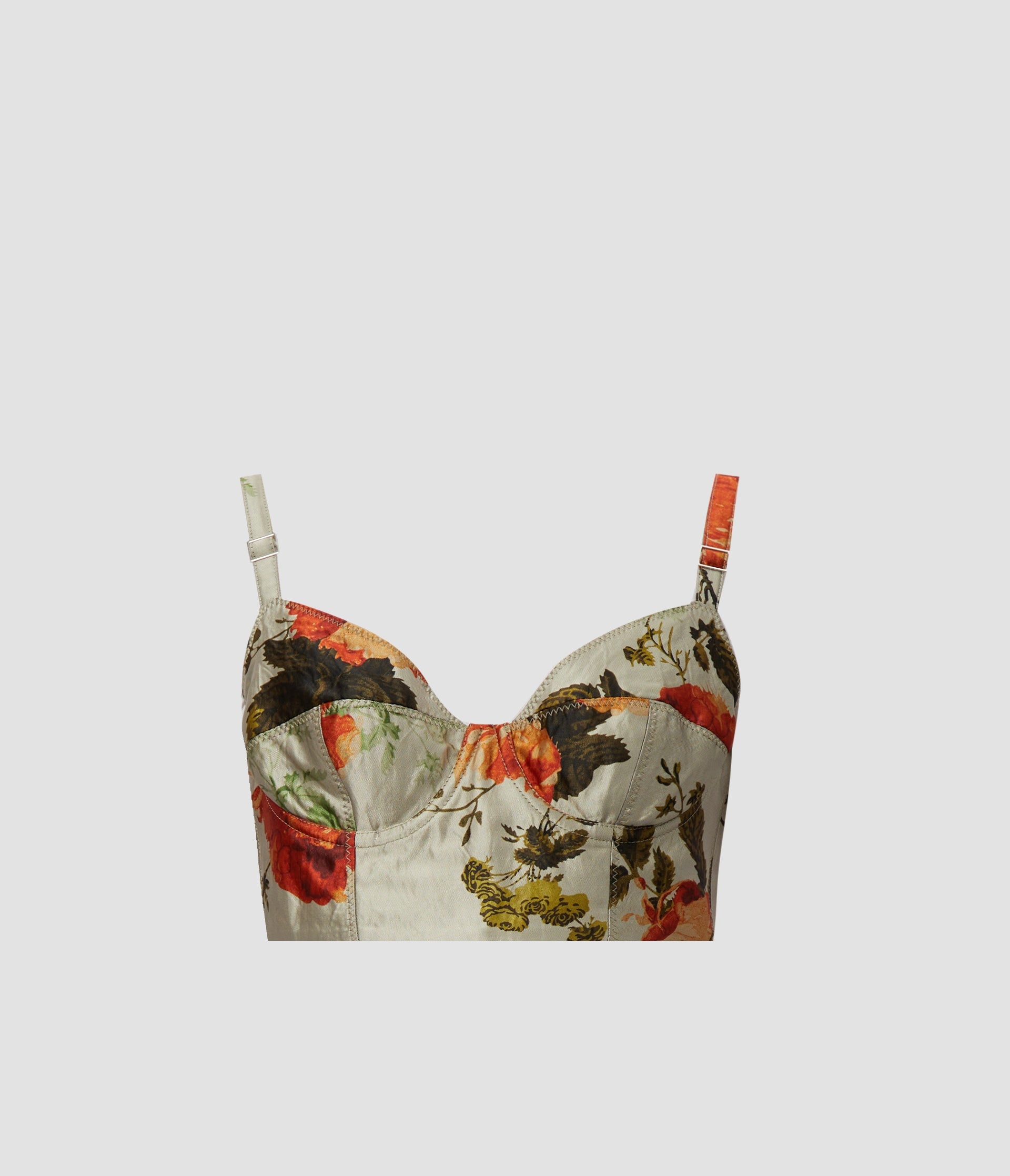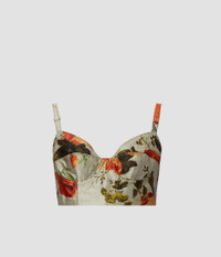 This structured bra top is crafted from textured pearl-hued satin that’s decorated with the season’s Rose print in vermillion. It has moulded cups and adjustable straps for the perfect fit. Size and Fit Model is 5'10" and wears a size UK 6. Fabric and Care 94% Polyester, 6% Metal. Lining: 75% Acetate, 25% Silk. Do Not Machine Wash / Delicate Dry Clean / Do Not Bleach / Do Not Tumble Dry / Cool Iron on Reverse.