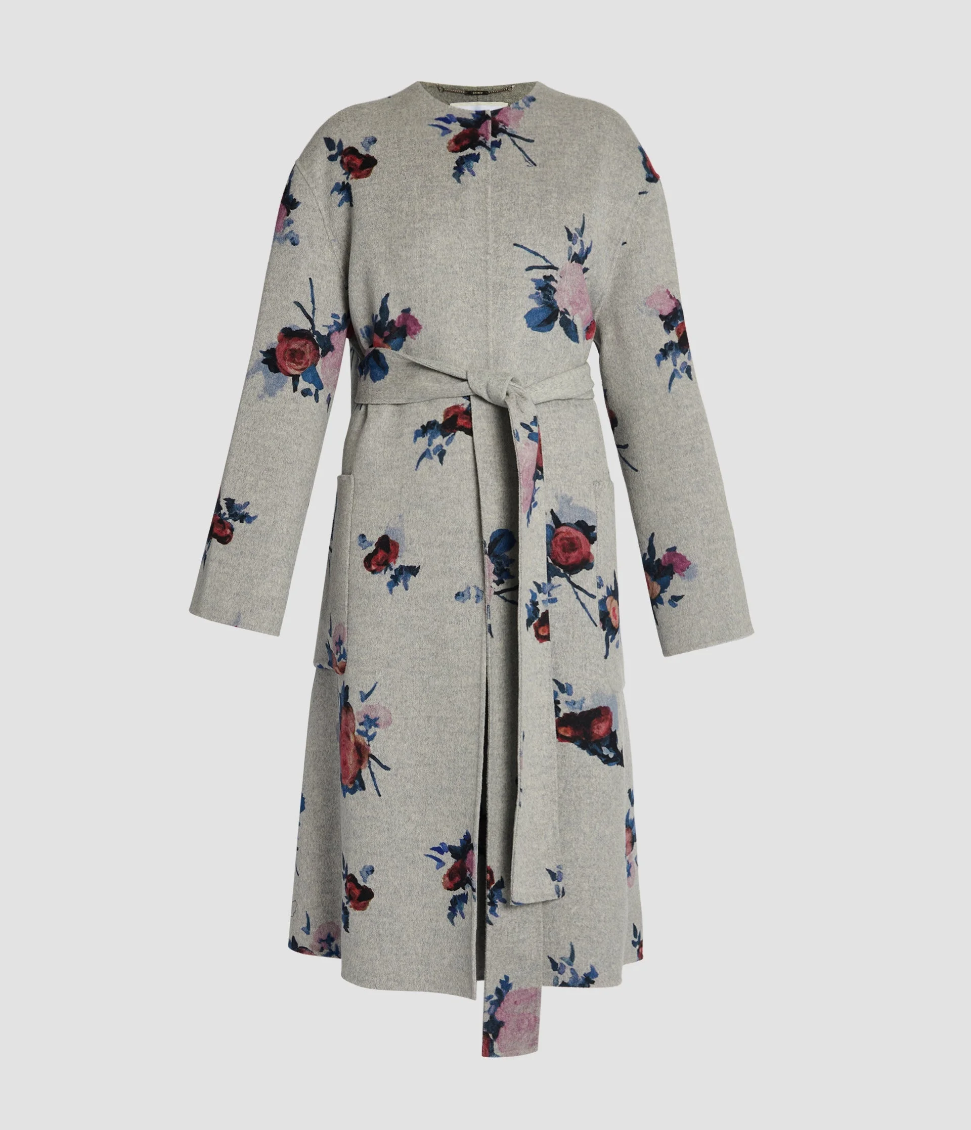 This grey coat is made from double-faced wool that is decorated with roses. It is shaped for a boxy fit and has a tie-fastening belt. - Boxy silhouette - Crew neck - Hook and eye fastening at centre front - Long sleeves - Patch pockets - Centre back vent - Unlined - Product code: PF25_C11_80051003 Fits oversized, recommend sizing down from your usual size. Fabric and Care 100% Wool. Embossing: 90% Silk, 10% Polyamide. Dry clean.