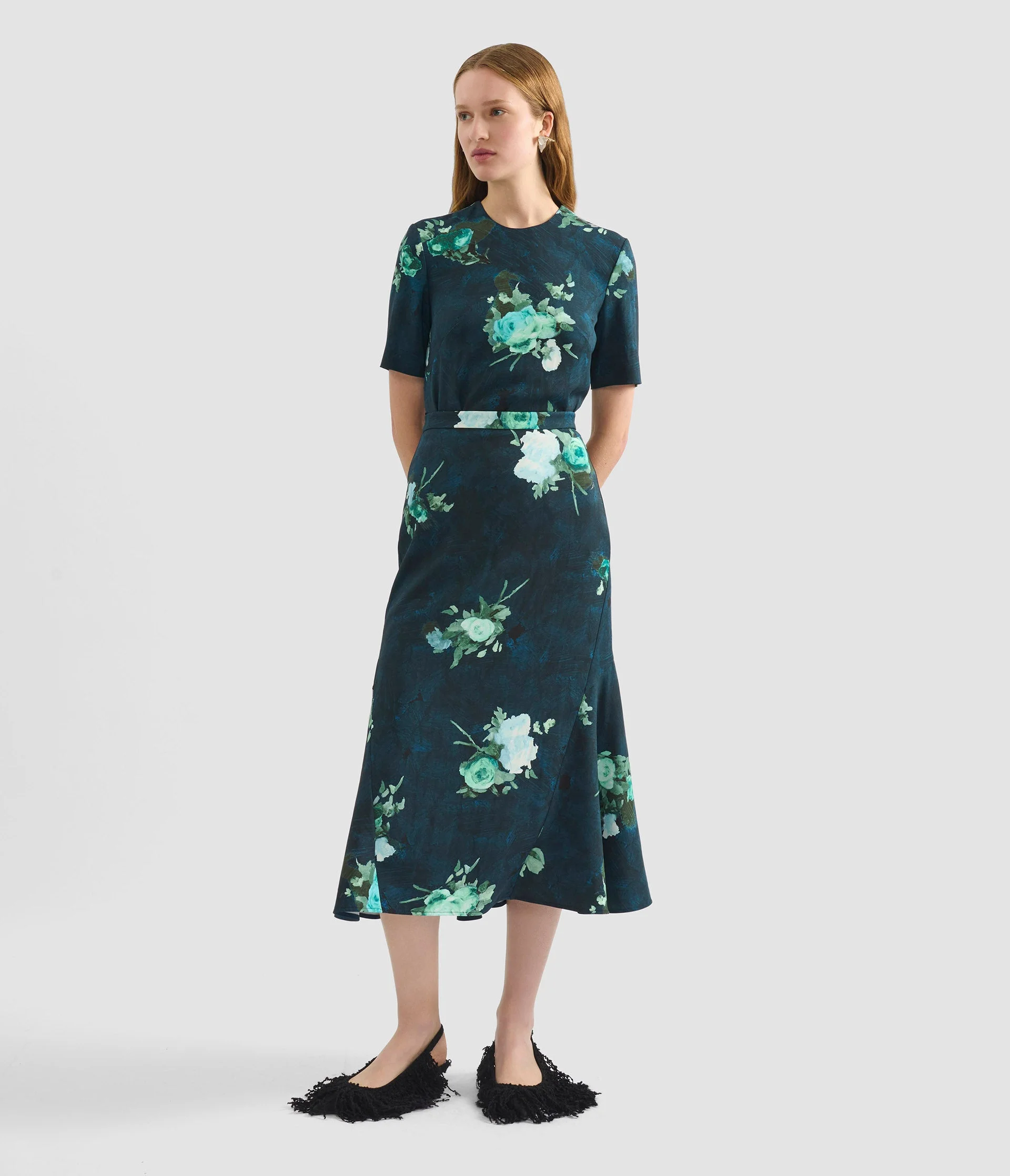 This stretch-cady skirt skims the hips before flaring to a fluted hem. The navy paint-effect ground is printed with abstract roses. - Fluted silhouette - Fully lined - Ankle length - Centre back hook, eye, and invisible zip fastenings - Product code: AW25_S26_50524001 Fits true to size. Fabric and Care 97% Viscose, 3% Elastane. Lining: 94% Silk, 6% Elastane.