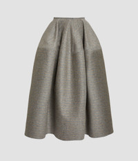 This voluminous midi skirt is sculpted from midweight grey flannel. The fabric has been bonded with a thin scuba-style jersey which holds its shape. - Voluminous silhouette - Fully lined - Ankle length - Centre back hook, eye, and invisible zip fastenings - Hidden side seam pockets - Product code: AW25_S36_70101003 Fabric and Care 93% Wool, 6% Mohair, 1% Polyamide. Scuba: 60% Polyuretane, 40% Polyester. Lining: 100% Silk. Dry clean.