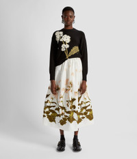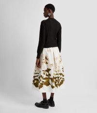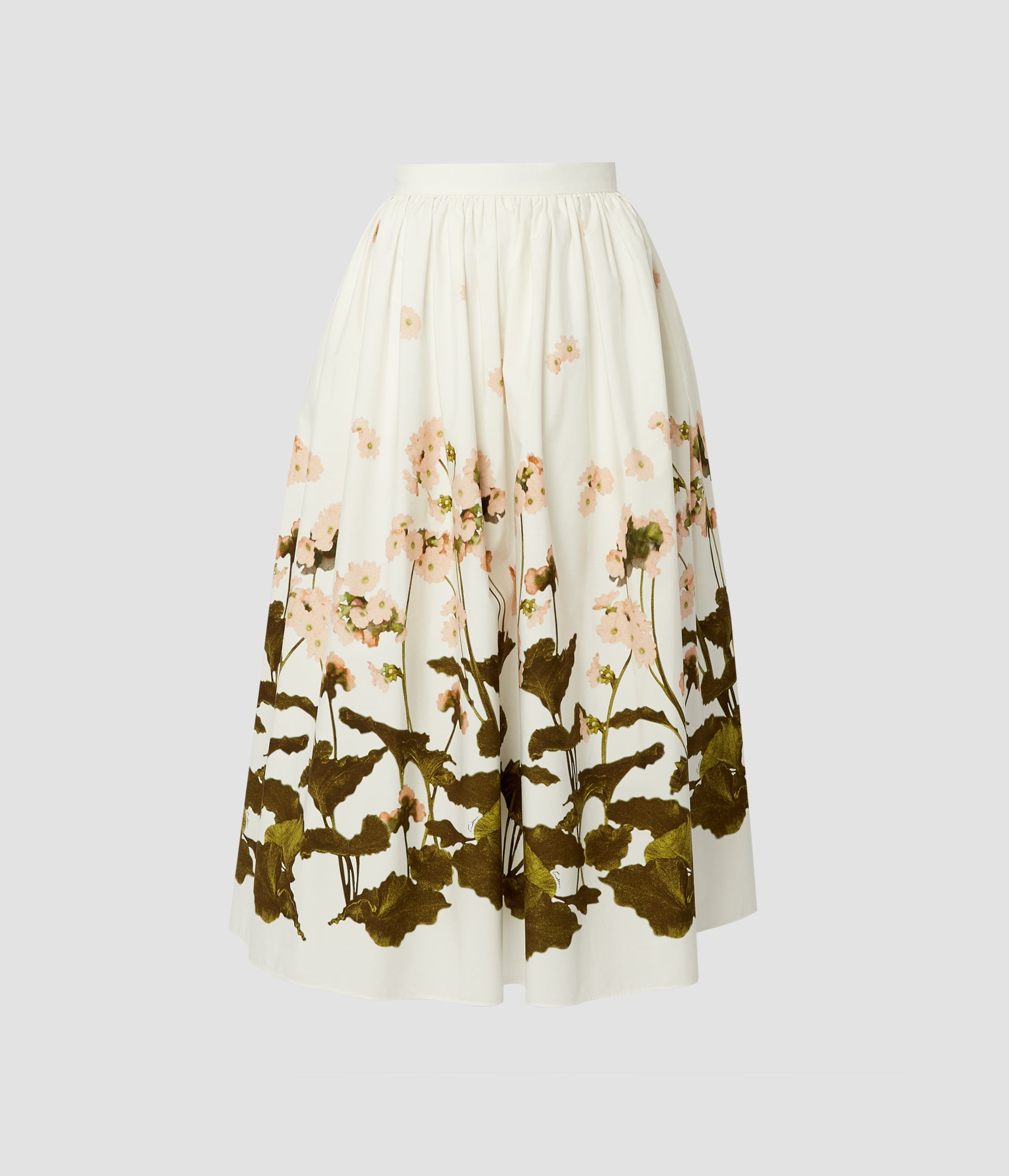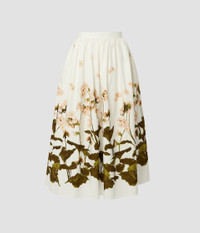 A hero print for PS25, Elena Garden is reimagined here in a selvedge iteration. The 1920s-inspired flowers are placed on the heavy cotton poplin to look as though they are growing up the skirt. A gathered waist makes for a voluminous silhouette. Size and Fit This mid-length skirt is gathered at the waist. It has hidden side seam pockets and a scalloped hem. It has hook, eye, and invisible zip fastenings at the centre back. Fits true to size. Fabric and Care 100% Cotton. Dry Clean.