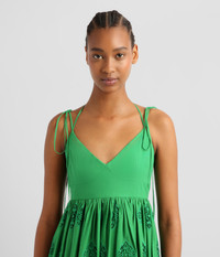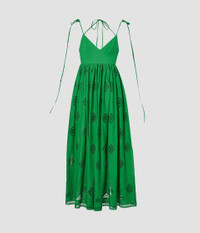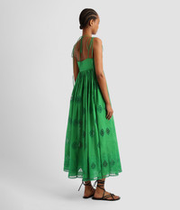Cut from a lightweight cotton-blend, this green dress is perfect for balmy summer days. It has fine, tie-fastening shoulder straps and a flattering V-neckline. The full skirt is detailed with delicate baroque-inspired cut-out embroidery and falls to an ankle-length hem. Size and Fit Model is 5'10" and wears a size UK 6. Fabric and Care 55% Cotton, 45% Polyester. Lining: 100% Cotton. Do Not Machine Wash / Delicate Dry Clean / Do Not Bleach / Do Not Tumble Dry / Cool Iron on Reverse.