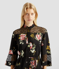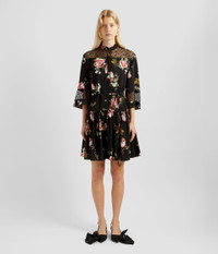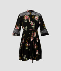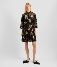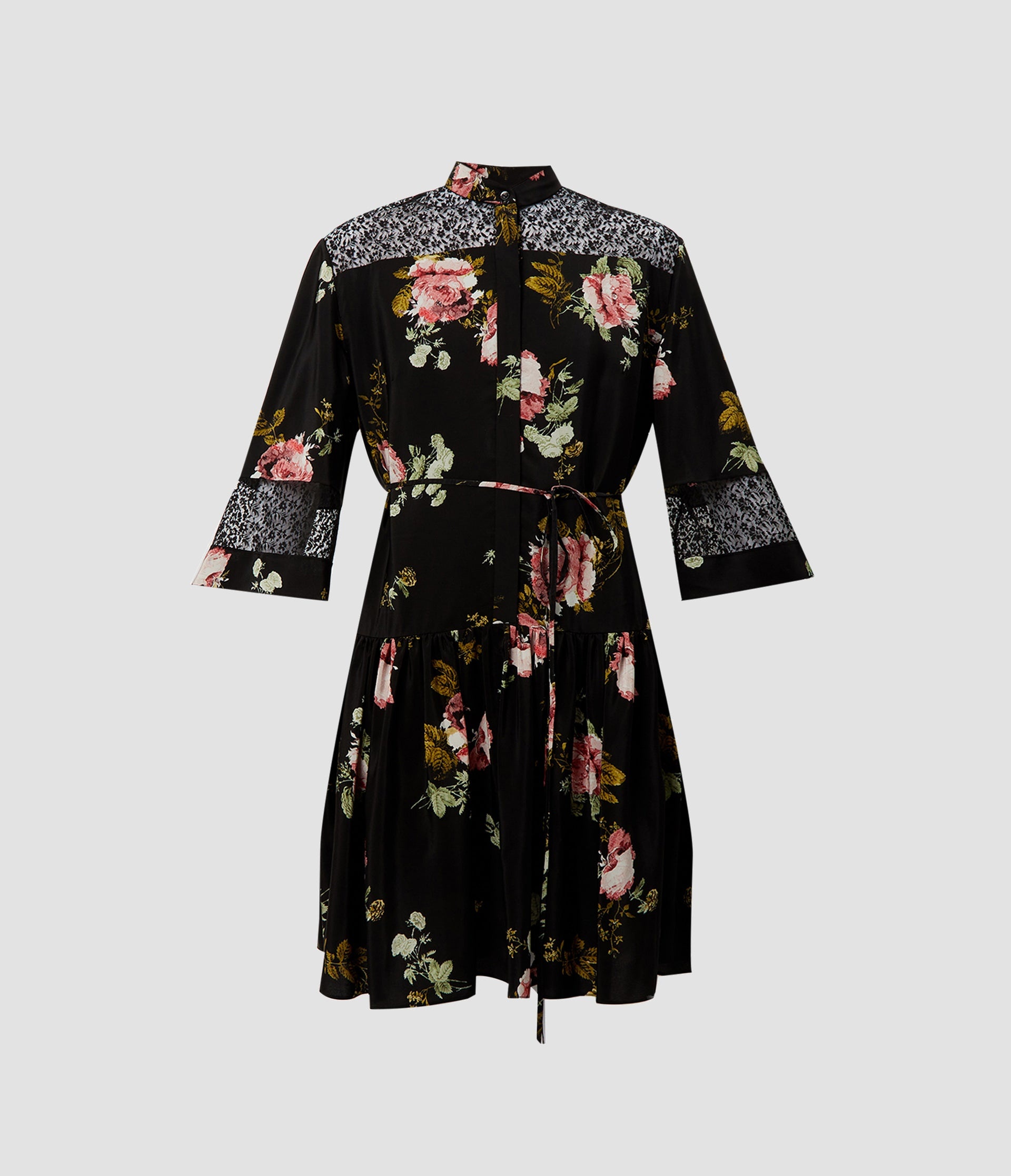 Cut from black silk crepe de chine, this dress is decorated with the Rose print in shades of blush and green. It has a stand collar and three quarter-length, wide sleeves. A tie-fastening belt adds structure to a floaty silhouette. Size and Fit Model is 5'10" and wears a size UK 6. Fabric and Care 100% Silk. Lining: 73% Acetate, 27% Silk. Do Not Machine Wash / Delicate Dry Clean / Do Not Bleach / Do Not Tumble Dry / Cool Iron on Reverse.