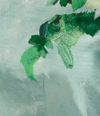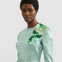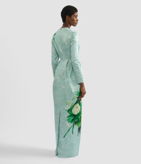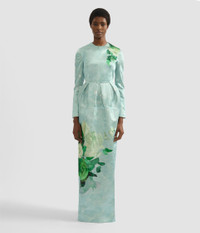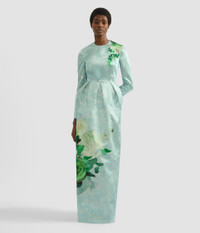 Gathering at the waist gives this gown volume at the hips. It is made from crushed mint satin and decorated with an abstract rose design. - Tulip silhouette - Fully lined - Floor length - Crew neck - Long sleeves - Centre back vent - Centre back hook, eye, and concealed zip fastenings - Product code: AW25_G48_50764011 Fits true to size. Model is 5'11 (180cm) and wears a size UK 8. Fabric and Care 100% Polyester. Lining: 73% Acetate, 27% Silk. Dry clean.