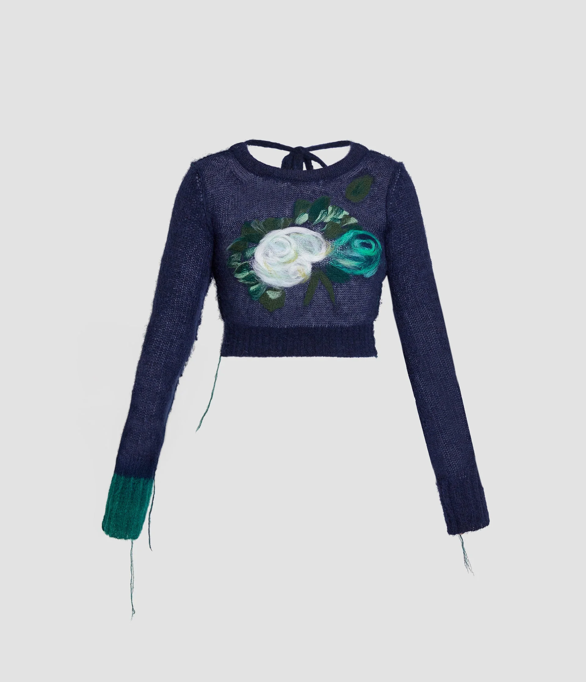 This open-knit pink jumper is spun from a fine alpaca blend and features a needle felt floral motif. It has exposed contrast linked seams, loose threads, and an open back. - Cropped fit - Lightweight knit - Crew neck - Long sleeves - Tie fastening at open back - Ribbed cuffs and hem - Needle felt flower - Product code: AW25_KT31_30104001 Fits true to size. Fabric and Care 50% Alpaca Superfine 50% Recycled Pa.