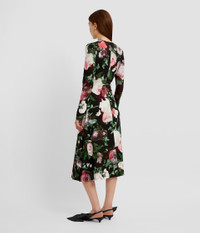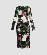 This black ponte jersey dress is printed with large-scale flowers in shades of white, pink, and green. It is gathered at the hip which gives the pencil skirt a draped effect. - Slim silhouette - Partially lined - Midi length - Crew neck - Long sleeves - Centre back zip fastening - Product code: PF25_JRD3_20011000 Fits true to size.Model is 5'10" (178cm) and wears a size UK 8. Fabric and Care 95% Viscose, 5% Elastane. Dry clean.