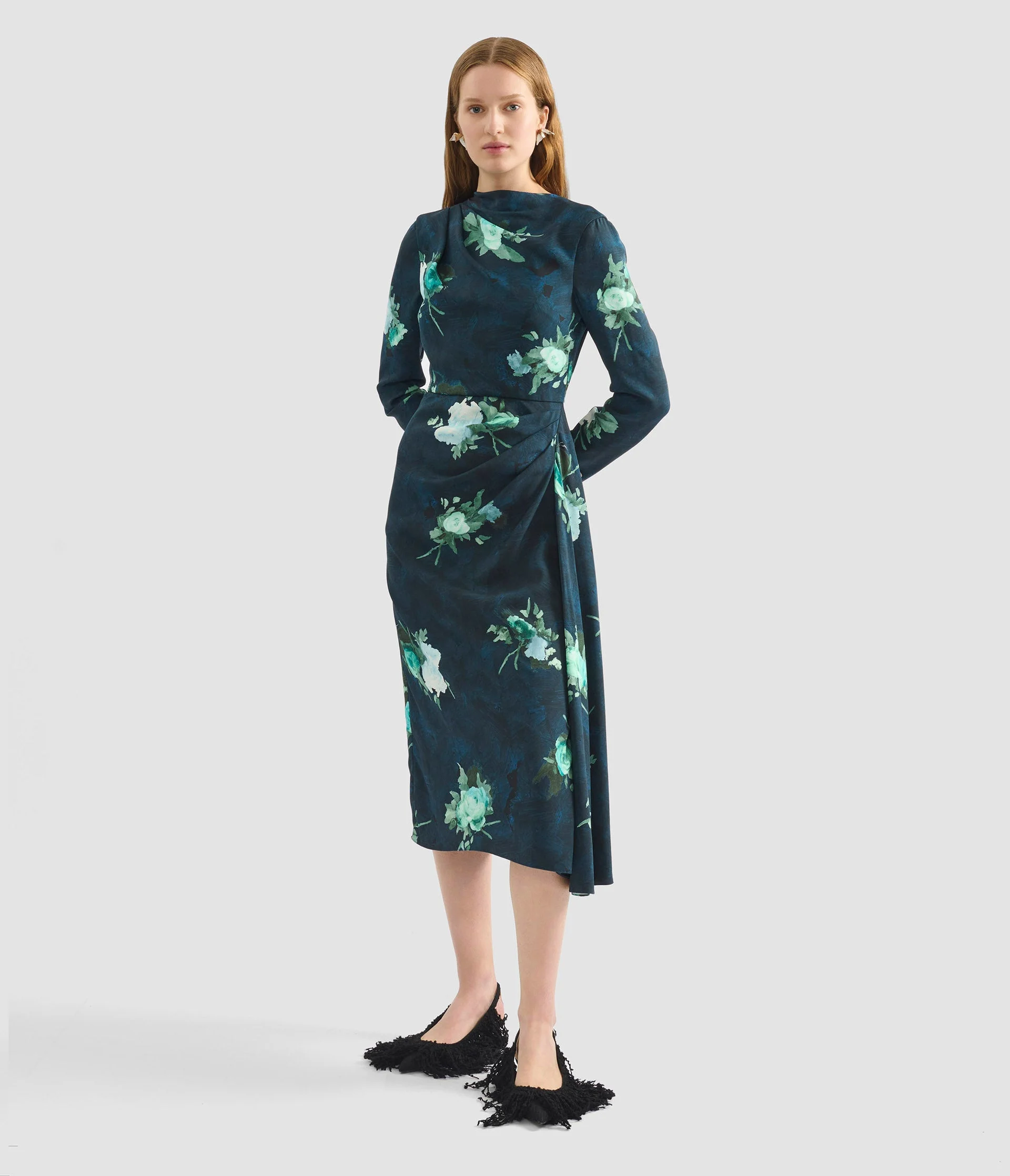 Made from navy stretch cady, this asymmetric dress is decorated with abstract roses. - Draped silhouette - Fully lined - Midi length - Draped neckline - Long sleeves - Centre back hook, eye, and concealed zip fastenings - Product code: AW25_D36_50524001 Fits true to size. Model is 5'11½ (181cm) and wears a size UK 8. Fabric and Care 97% Viscose, 3% Elastane. Lining: 94% Silk, 6% Elastane. Dry clean.