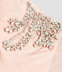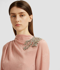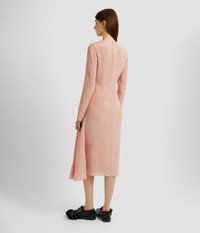 Cut from dusty-rose crinkled jacquard, this dress features a floral design and crystal embroidery at the shoulder. It is draped at the neckline and waist. Sheath silhouette Fully lined Midi length Draped neck Long sleeves Centre back zip fastening Back split Product code: SS25_D36_PIJQFSK Fits true to size. Model is 5'11 (180cm) and wears size UK 6. Fabric and Care 66% Silk, 34% Cotton. Lining: 100% Silk, Embroidery: 62% Glass, 25% Brass, 10% Nylon, 3% Polyester. Dry clean.