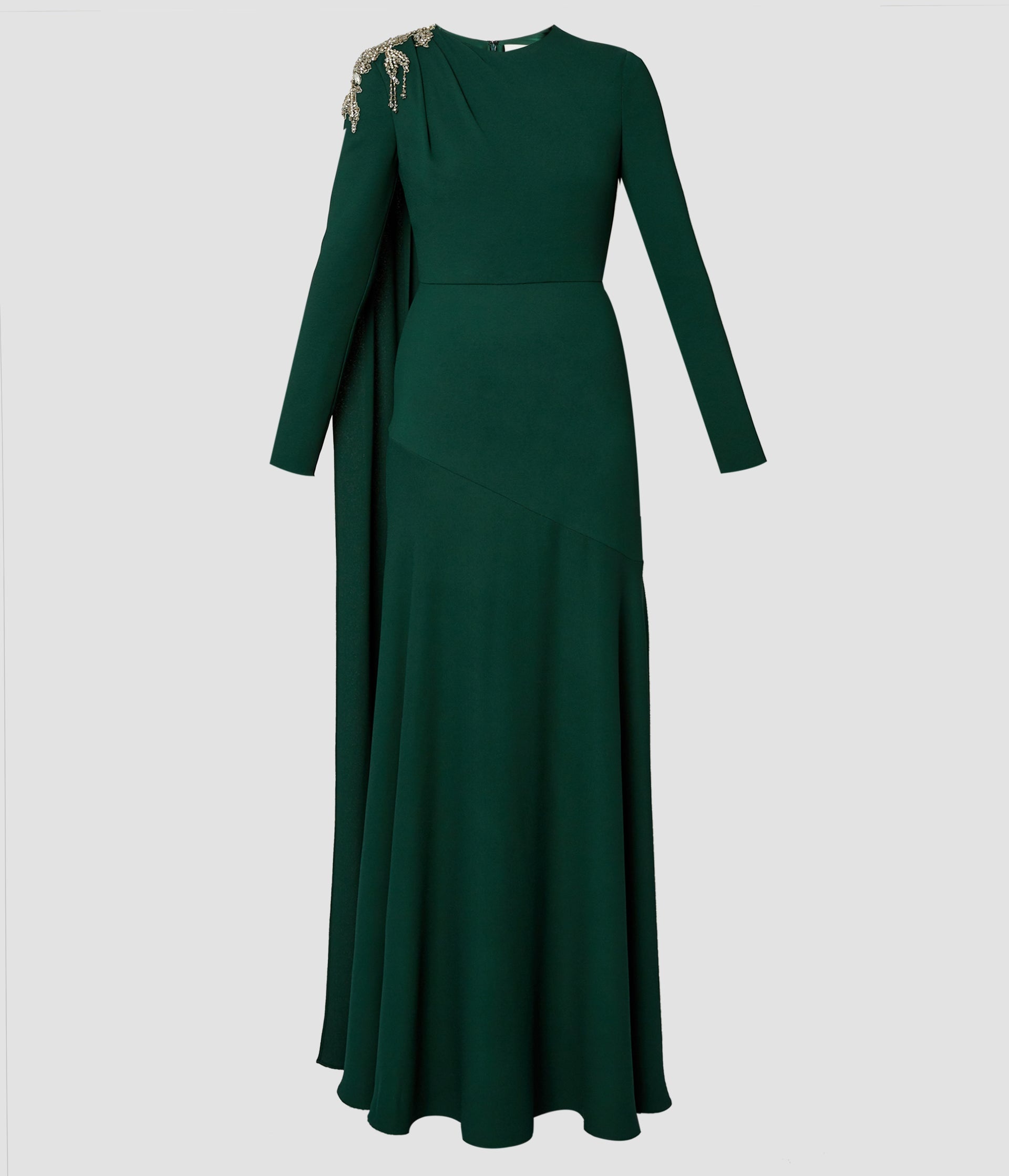 A celebration of the enduring appeal of jewel tones, this gown is artfully draped from pine green sable. It has a crew neck, long sleeves, and slightly flared, floor-length skirt, while a shoulder sash brings added drama. The hand embroidery is inspired by the dresses favoured by 1920s flapper girls. It is made up of antique-silver glass beads, crystal stones and metallic outlining. Size and Fit This floor-length gown has a crew neckline and long sleeves. It has a long shoulder sash and an asymmetric seam at the skirt. It has hook, eye, and invisible zip fastenings at the centre back, and is partially lined in pine green crepe de chine. Fits true to size. Fabric and Care 96% Viscose, 4% Elastane. Lining: 73% Acetate, 27% Silk. Embroidery: 70% Glass, 20% Brass, 5% Metal, 5%Polyester. Dry Clean.