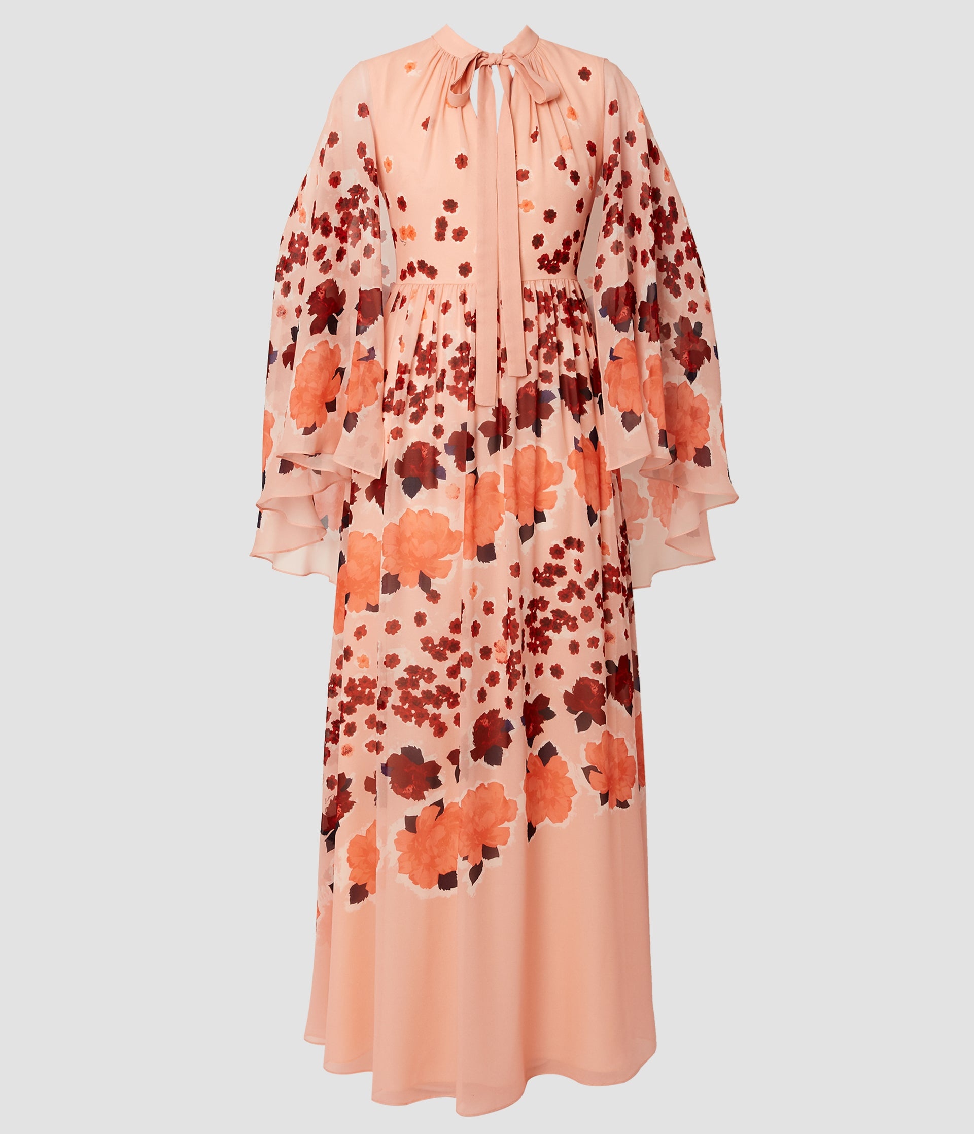 Cut from lightweight silk voile, this cloud-pink dress moves beautifully as you walk. Its romantic silhouette is defined by cape-style sleeves, a tie-fastening keyhole neckline, and a floor-sweeping hem. The fabric is decorated with a version of the season’s Margot Floral, made up of peonies, roses, and other small blossoms in shades of red, coral, and navy. Size and Fit This floor-length gown has a tie-fastening keyhole neckline and cape-style sleeves. It has two button fastenings and a zip fastening at the centre back. The bodice and skirt are fully lined in strawberry silk crepe de chine. Fits true to size. Fabric and Care 100% Silk. Lining: 100% Silk. Dry Clean.