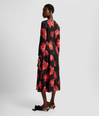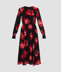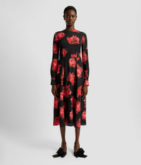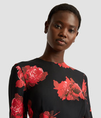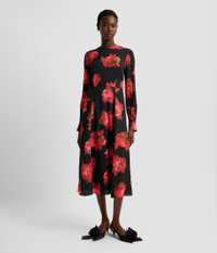 This black dress is decorated with the Rossini Rose print, an expressive red floral painted in bold brushstrokes. It is crafted from a lightweight viscose crepe which complements the feminine cut. A crew neck, long sleeves, and A-line skirt keep the mood classic. Size and Fit Model is 5'10" and wears a size 6. Fabric and Care 100% Viscose. Lining: 100% Silk. Dry Clean.