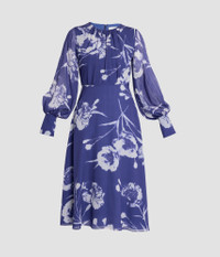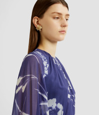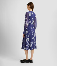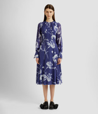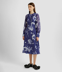 In a deep heather hue, this heavy silk voile dress showcases a large-scale carnation print. It is gathered at the crew neck and fitted cuffs. Fit and flare silhouette Lined at bodice and skirt Midi length Crew neck Blouson sleeves Centre back hook, eye, and concealed zip fastenings Product code: SS25_D21_PCFSV Fits true to size. Model is 5'11 (180cm) and wears size UK 6. Fabric and Care 100% Silk. Lining: 100% Silk. Dry clean.