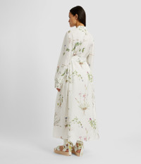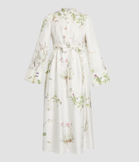 Cut from lightweight silk twill, this dress is printed with a botanical garden design. It has a stand collar and wide sleeves, while a tie-fastening belt lends the straight silhouette definition. Straight silhouette Unlined Midi length Stand collar Wide sleeves with piped cuffs Centre front button fastenings Hidden side seam pockets Product Code: VC25_D55_WBFST Fits oversized, recommend sizing down from your usual size for a closer fit. Model is 5'8½ (174cm) and wears size UK 6. Fabric and Care 100% Silk. Dry clean.