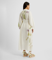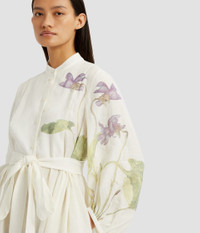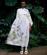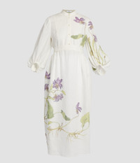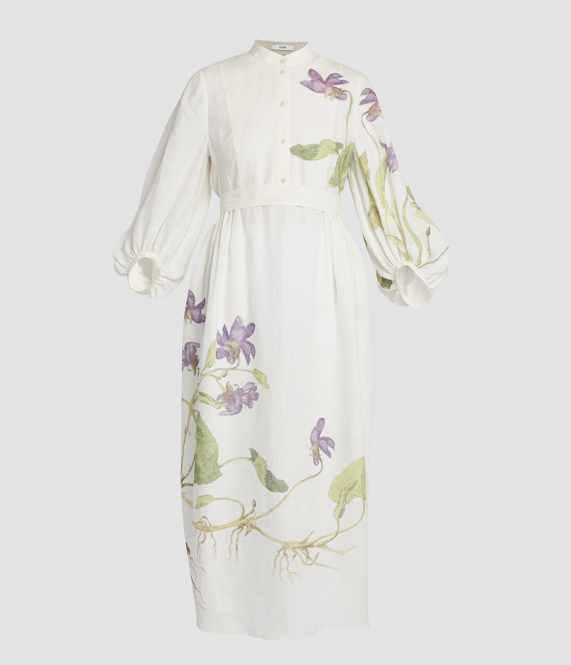 Cut from lightweight white linen, this mid-length dress has a stand collar, three quarter-length gathered sleeves and a tie-fastening waist. The fabric is printed with botanical illustrations of violets. Straight silhouette Unlined Midi length Stand collar Three quarter-length gathered sleeves Centre front button fastenings Hidden side seam pockets Product Code: VC25_D911_PBFLIP Relaxed fit through the body. Fits true to size. If in between sizes, recommend sizing down. Model is 5'8½ (174cm) and wears size UK 6. Fabric and Care 100% Linen. Dry Clean.