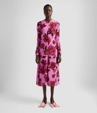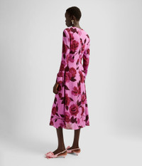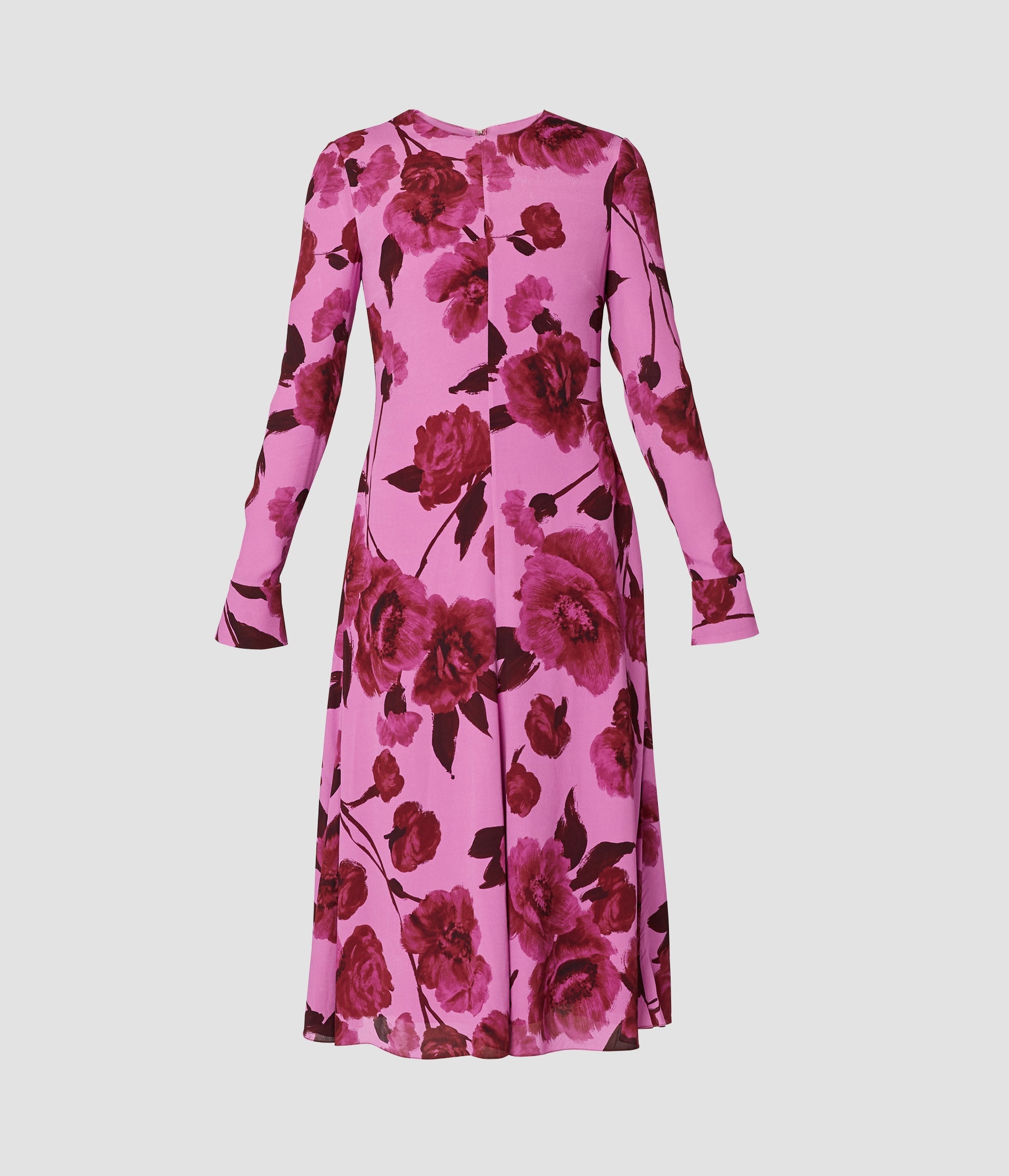 Cut from pink crepe, this elegant dress has long sleeves with slightly flared cuffs that are echoed in the A-line skirt. It is decorated with the season’s Violetta Bloom design, a floral inspired by hand painted prints from the 1950s and ‘60s. Size and Fit This mid-length dress has a crew neck and long sleeves with flared cuffs. It is partially lined in pink silk crepe de chine and has a centre back zip fastening. Fits true to size. Model is 5'10" and wears a size UK 6. Fabric and Care 100% Viscose. Lining: 100% Silk. Do Not Machine Wash / Delicate Dry Clean / Do Not Bleach / Do Not Tumble Dry / Cool Iron On Reverse.
