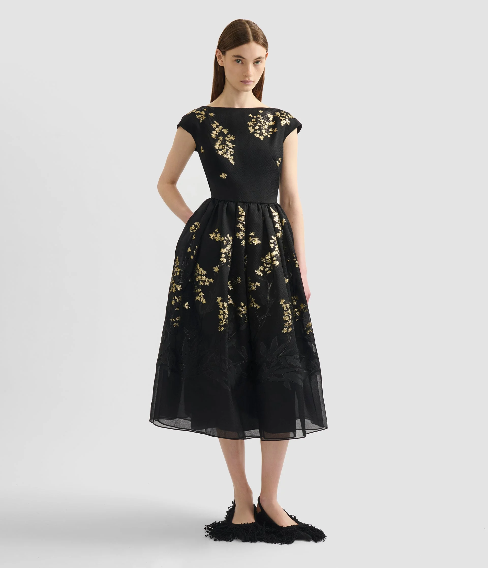 Crafted from textured silk organza, this black dress is decorated with trailing fil coupe florals. The gold motifs are achieved using a mix of matte and shiny thread work. - Fit and flare silhouette - Fully lined - Midi length - Straight neckline - Cap sleeves - Centre back hook, eye, and concealed zip fastenings - Hidden side seam pockets - Product code: HO26_D43_50081000 Fits true to size. Fabric and Care Main: 83% Silk, 10% Polyester, 6% Metallised Polyester, 1% Nylon. Secondary: 100% Silk. Lining: 100% Silk. Dry clean.