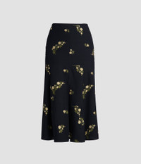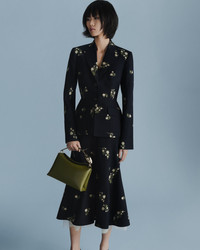 This mid-length pencil skirt is made from midnight blue floral jacquard which is woven with small yellow flowers. - Pencil silhouette - Fully lined - Midi length - Centre back split - Centre back hook, eye, and concealed zip fastenings - Product code: PF25_S13_70014007 Fits true to size. Fabric and Care 88% Virgin Wool, 12% Cotton. Lining: 73% Acetate, 27% Silk. Dry clean.