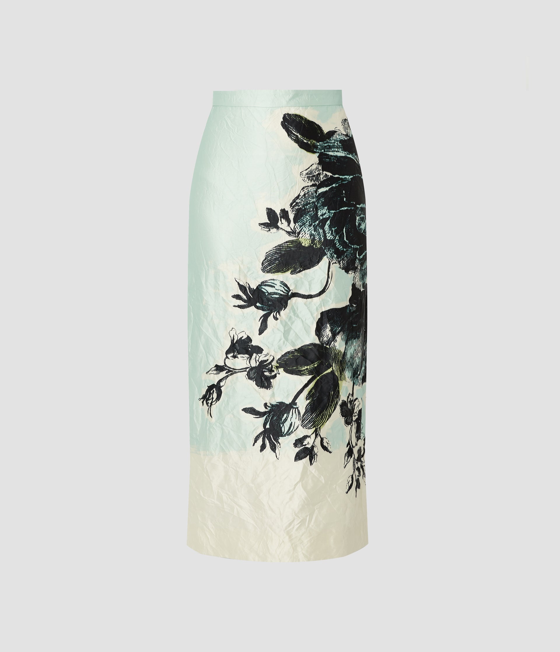 Cut from textured satin, this pencil skirt is decorated with our Violetta Etching design for a feminine yet graphic floral placement. In blue and white, the digitally printed, lustrous satin is woven with subtle metallic yarns for added sheen. Size and Fit This mid-length pencil skirt has a centre back vent. It has hook, eye, and invisible zip fastenings at the centre back, and is fully lined in ivory silk crepe de chine. Fits true to size. Fabric and Care 94% Polyester, 6% Metal. Lining: 100% Silk. Dry Clean.