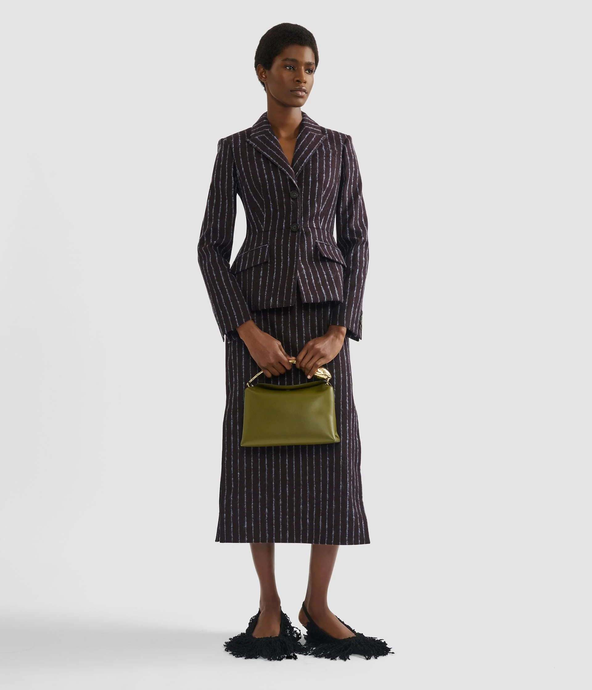 Presenting a softer take on a classic pinstripe, this nightshade-hued jacket is made from a brushed flannel. The fabric has been bonded with a thin jersey backing to enhance the piece’s structured silhouette. - Fit and flare silhouette - Lapel collar - Centre front button fastenings - Long sleeves - Welt and jet pockets - Fully lined - Product code: AW25_J9_70076003 Fits true to size. Model is 5'11 (180cm) and wears a size UK 8. Fabric and Care 93% Wool, 6% Mohair, 1% Polyamide. Lining: 100% Cupro Bemberg. Dry clean.