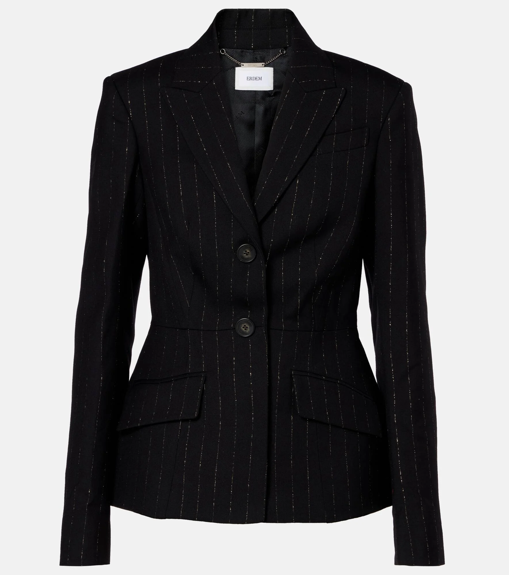 Incorporate modern romance into your edit with Erdem's whimsical and delicate designs. This blazer is made from wool and features a delicate pinstripe motif with shimmering threads that give a shiny touch to the look. Product Details - Material: 98% wool, 2% polyester - Care instructions: dry clean - Made in the UK - Color: black - Designer color name: Black+Gold - Item color: black - Material II: 50% wool, 50% viscose - Lining: 100% cupro - Notched lapel - Cuff: four buttons - Pockets: breast pocket, flap pockets - Closure: single-breasted (two buttons) - Item number: P01081976 Size & Fit - True to size - Shoulder pad inserts - Cinched waist - Non-stretchy fabric - Falls below the hip - The model seen in the picture is 178cm-5'10" and wearing a size UK 8