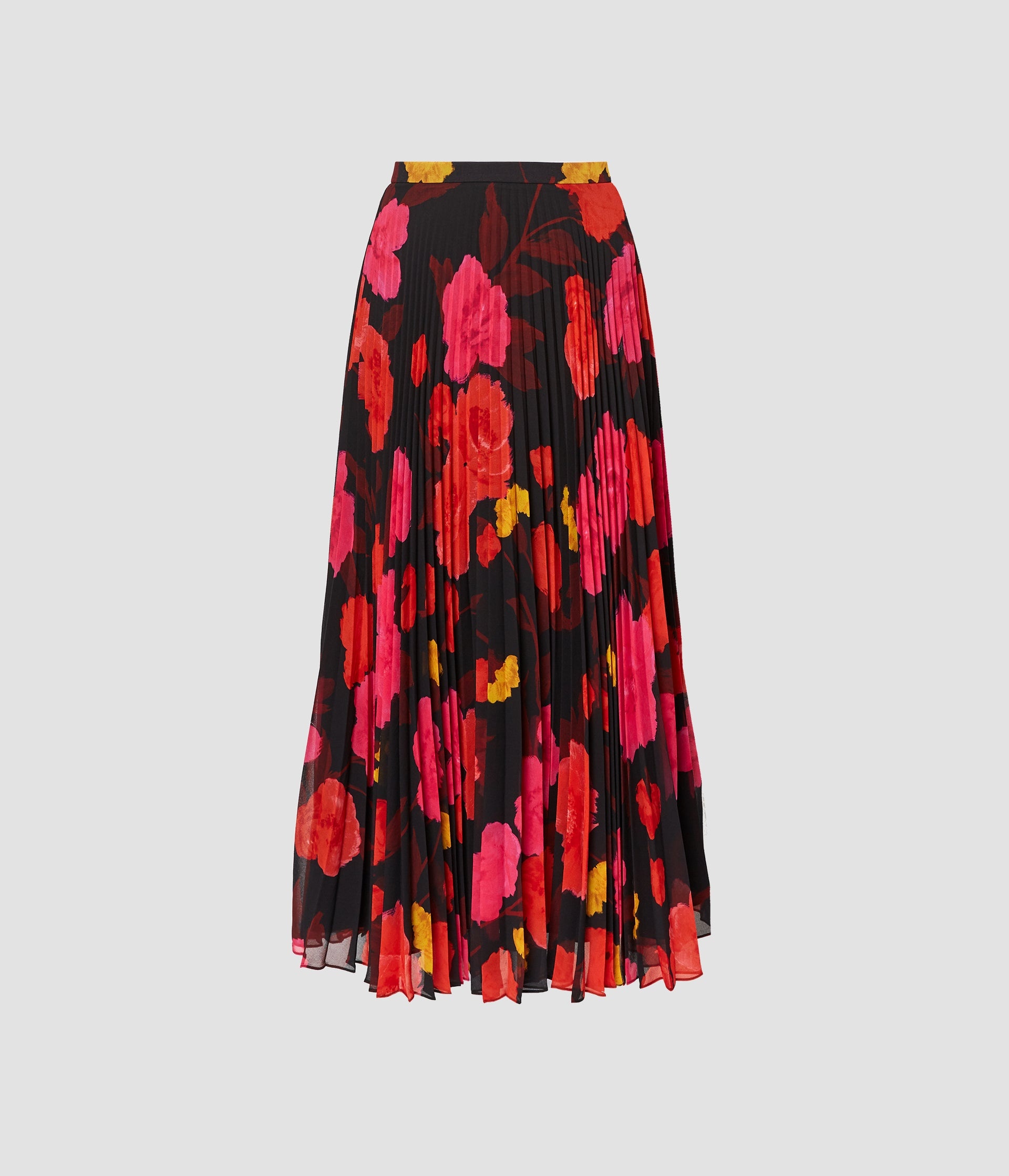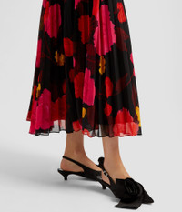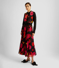 This mid-length skirt is crafted from sharply pleated voile for a sense of movement and drama. The lightweight black fabric showcases this season’s Violetta Bloom print, an homage to the hand painted couture florals of the 1950s and ‘60s. Size and Fit This pleated midi skirt has a centre back invisible hook, eye, and zip fastening, and is fully lined in black silk crepe de chine. Fits true to size. Model is 5'10" and wears a size UK 6. Fabric and Care 100% Polyester. Lining: 100% Silk. Do Not Machine Wash / Delicate Dry Clean / Do Not Bleach / Do Not Tumble Dry / Cool Iron On Reverse.