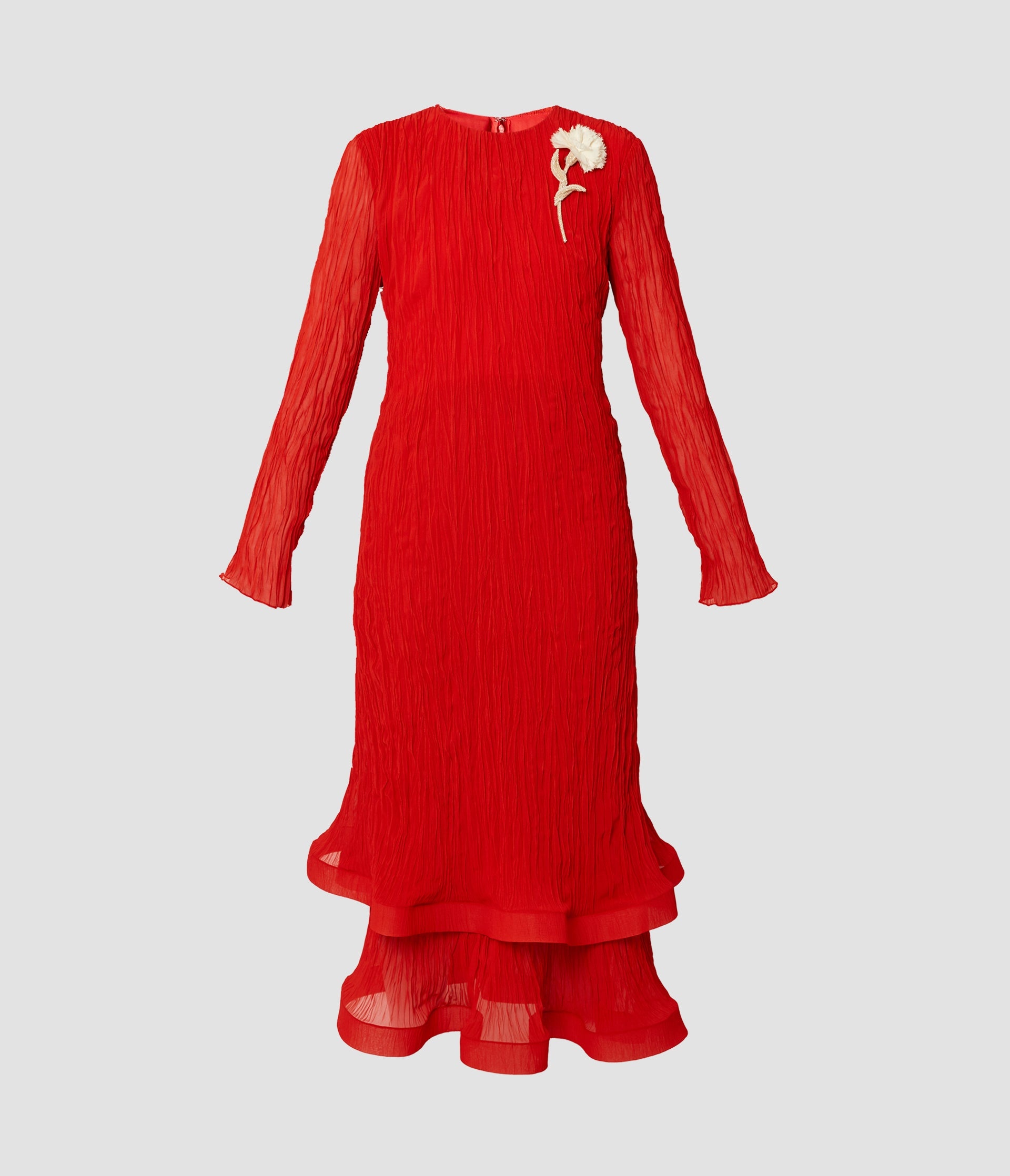 In red plisse georgette, this mid-length dress makes an eye-catching choice. With a crew neckline and long sleeves, it skims the body before flaring to a crinoline, double-layered hem. It has a beaded carnation brooch at the collar, a recurring motif throughout the PS25 collection. Size and Fit This mid-length dress has a crew neckline, long sleeves, and a layered crinoline hem. It has hook, eye, and invisible zip fastenings at the centre back. The bodice is lined in vermillion stretch-georgette.Fits true to size. Fabric and Care 100% Polyester. Lining: 93% Silk, 7% Elastane, Brooch Embroidery: 3D Petal: 34% Viscose, Beads: 33% Glass, Wire Embroidery: 33% Brass, Pin: 100% Brass. Dry Clean.