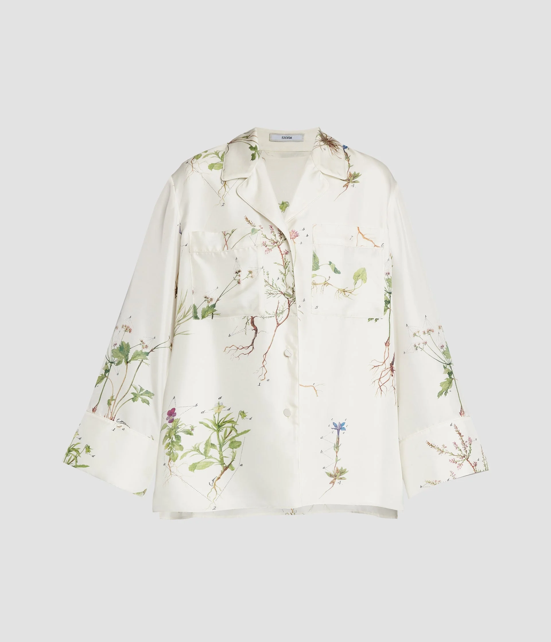 With drop shoulders and wide sleeves, this silk twill shirt is cut for a relaxed, boxy fit. The fabric is printed with a botanical design. Boxy silhouette Unlined Lapel collar Long, wide sleeves with piped cuffs Centre front button fastenings Front patch pockets Drop shoulders Product Code: VC25_T28_WBFST Fits oversized, recommend sizing down from your usual size for a closer fit. Model is 5'8½ (174cm) and wears size UK 6. Fabric and Care 100% Silk. Trims: 100% Silk. Dry clean.
