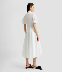 This feminine dress is cut from crisp white cotton poplin. It has a point collar that’s framed by short, twisted sleeves, and flares to an A-line skirt. The neckline is adorned with an oversized corsage, an homage to the opera singer Maria Callas and the flowers thrown on-stage by adoring fans. Size and Fit This mid-length shirt dress has short, twisted sleeves, a fitted waist, and an A-line skirt. It has a centre-front button-fastening placket. Fits true to size. Model is 5'10" and wears a size UK 6. Fabric and Care 100% Cotton. Do Not Machine Wash / Delicate Dry Clean / Do Not Bleach / Do Not Tumble Dry / Cool Iron On Reverse.