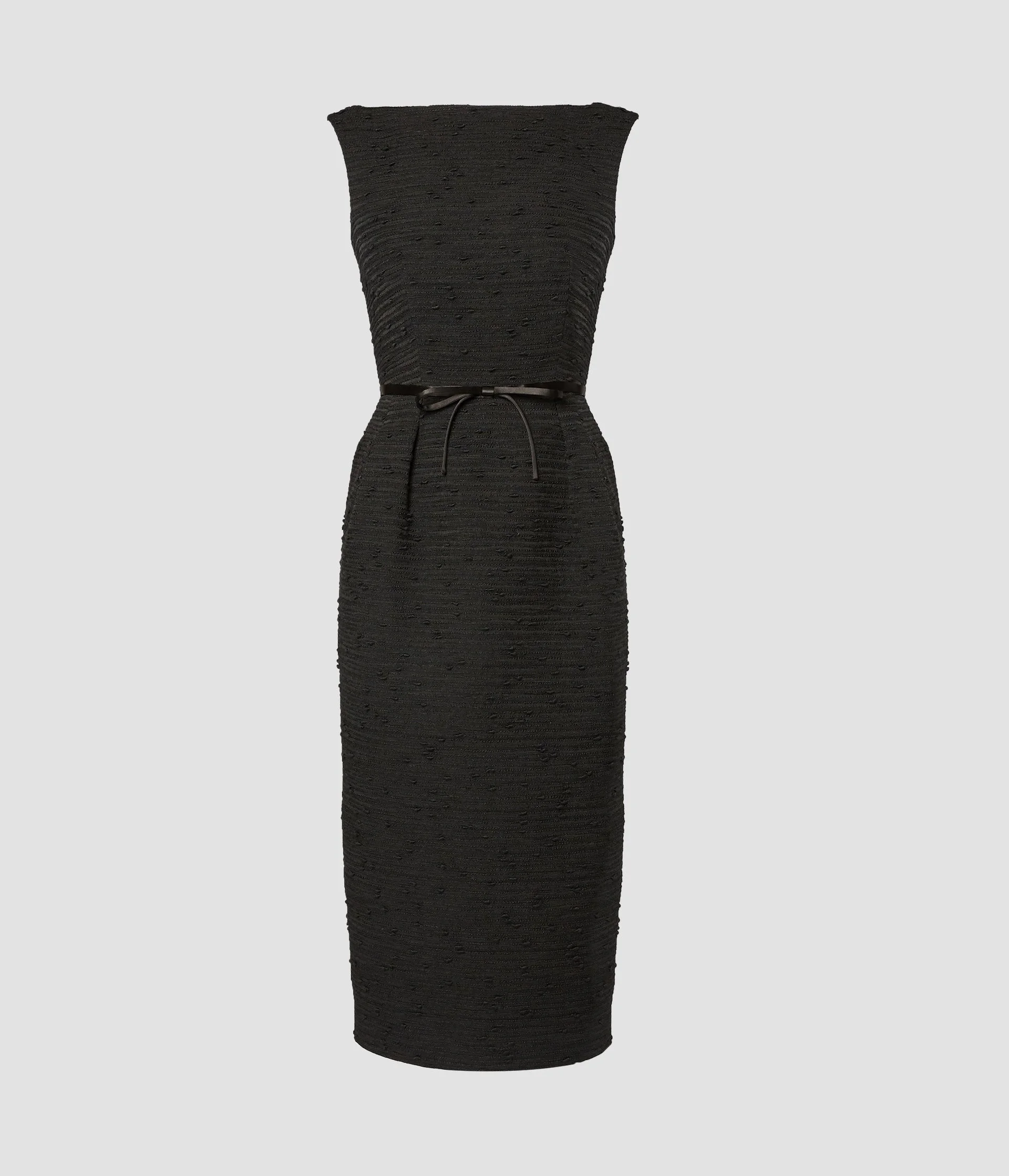 Exuding classic appeal, this black midi dress blurs the lines between workwear and eveningwear. It is crafted from black tweed and shaped for a slim silhouette with a 1950s-inspired boat neck and pencil skirt. Subtly feminine detailing comes by way of a slim tie-fastening bow at the fitted waist. Size and Fit This sleeveless midi dress has a slash neckline, a tie fastening at the waist, side seam pockets, and a centre back vent. It is fully lined in black silk crepe de chine and has a centre back concealed zip fastening. Fits true to size. Model is 5'10" and wears a size UK 6. Fabric and Care 54% Polyester, 17% Cotton, 15% Acrylic, 6% Virgin Wool, 6% Wool, 2% Other Fibres. Lining: 100% Silk. Belt: 72% Viscose, 28% Silk. Do Not Machine Wash / Delicate Dry Clean / Do Not Bleach / Do Not Tumble Dry / Cool Iron On Reverse.