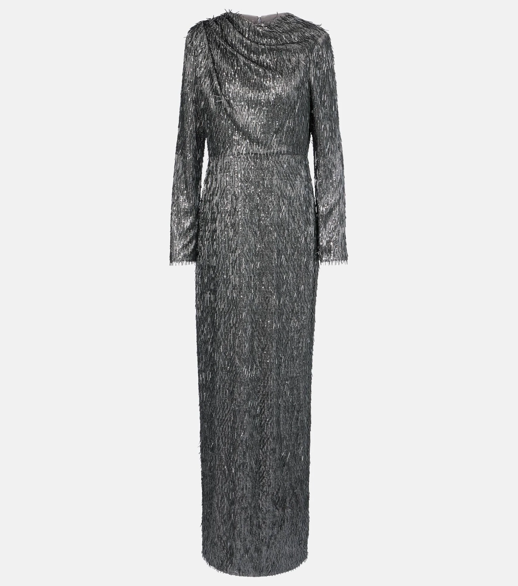 Incorporate modern romance into your edit with Erdem's whimsical and delicate designs. This long-sleeved maxi dress boasts a draped bodice and all-over sequins that add a shimmering touch and a textural twist to the ensemble. Product Details - Material: 95% polyester, 5% elastane - Care instructions: dry clean - Made in the UK - Designer color name: Gunmetal - Item color: silver - Details: 100% polyethylene - Lining: 100% silk - Closure: concealed zipped back - Short vent - Item number: P01081968 Size & Fit - True to size - Fitted - Non-stretchy fabric - slit length 60cm-23.5" - The model seen in the picture is 178cm-5'10" and wearing a size UK 8