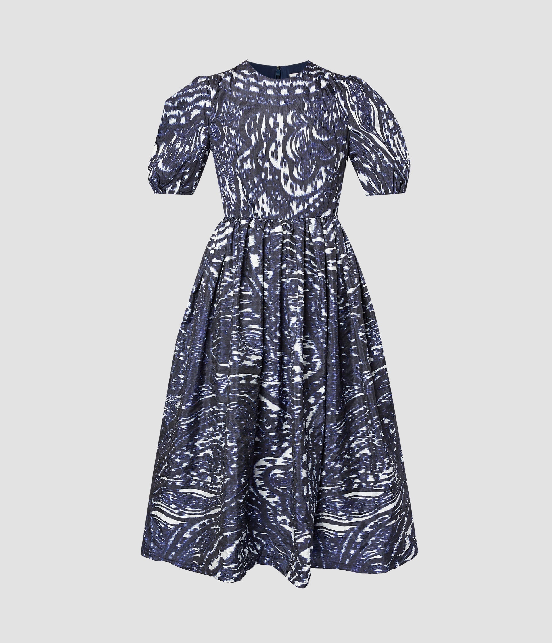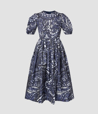 For Pre-Fall ’24, inspiration comes from the wardrobe of Maria Callas as well as 1950s and ‘60s couture. With its puffed sleeves and A-line skirt, this taffeta dress captures the mood. It is decorated with an abstract, large scale paisley print in rich indigo tones on an off-white base. Size and Fit This calf-length dress has a round neck and short, gathered sleeves. It has a fitted waist and an A-line skirt with hidden side pockets. The bodice is lined in navy crepe de chine and the skirt is lined in navy silk organza. It has centre back invisible hook, eye, and zip fastenings. Fits true to size. Model is 5'10" and wears a size UK 6. Fabric and Care 92% Polyester, 8% Metal. Lining: 100% Silk. Lining2: 73% Acetate, 27% Silk. Do Not Machine Wash / Delicate Dry Clean / Do Not Bleach / Do Not Tumble Dry / Cool Iron On Reverse.