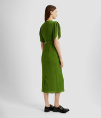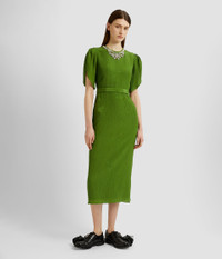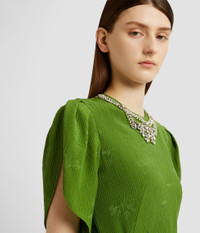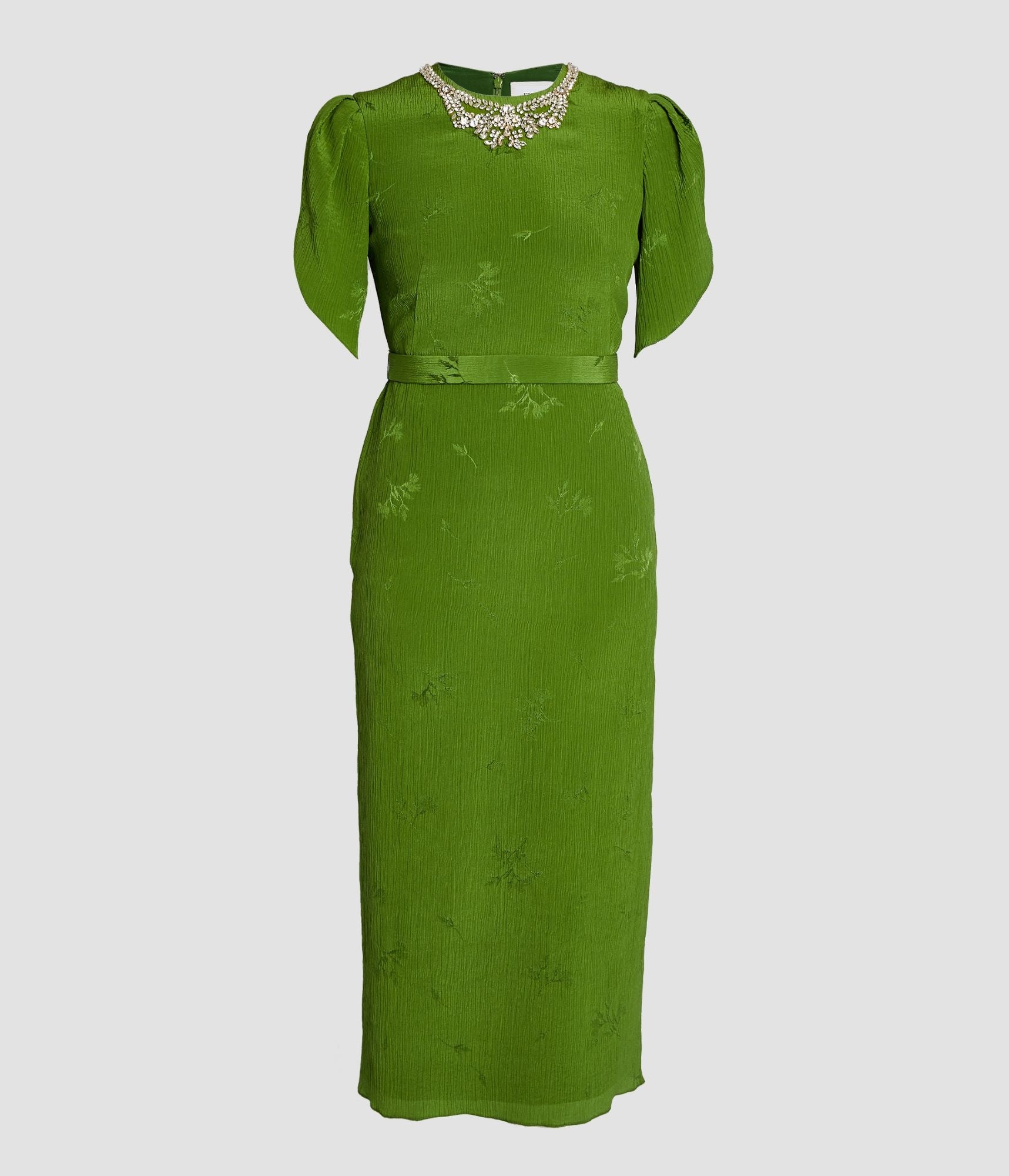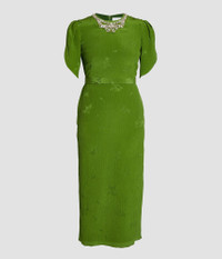 Woven with a floral design, this crinkle jacquard dress is embellished with crystals at the crew neckline. The sheath silhouette is framed by tulip sleeves and a belt. Sheath silhouette Fully lined Midi length Crew neck Tulip sleeves Centre back hook, eye, and concealed zip fastenings Back vent Product code: SS25_D901_GJQFSK Fits true to size. Model is 5'11 (180cm) and wears size UK 6. Fabric and Care 66% Silk, 34% Cotton. Lining: 100% Silk. Embroidery: 62% Glass, 25% Brass, 10% Nylon, 3% Polyester. Dry clean.
